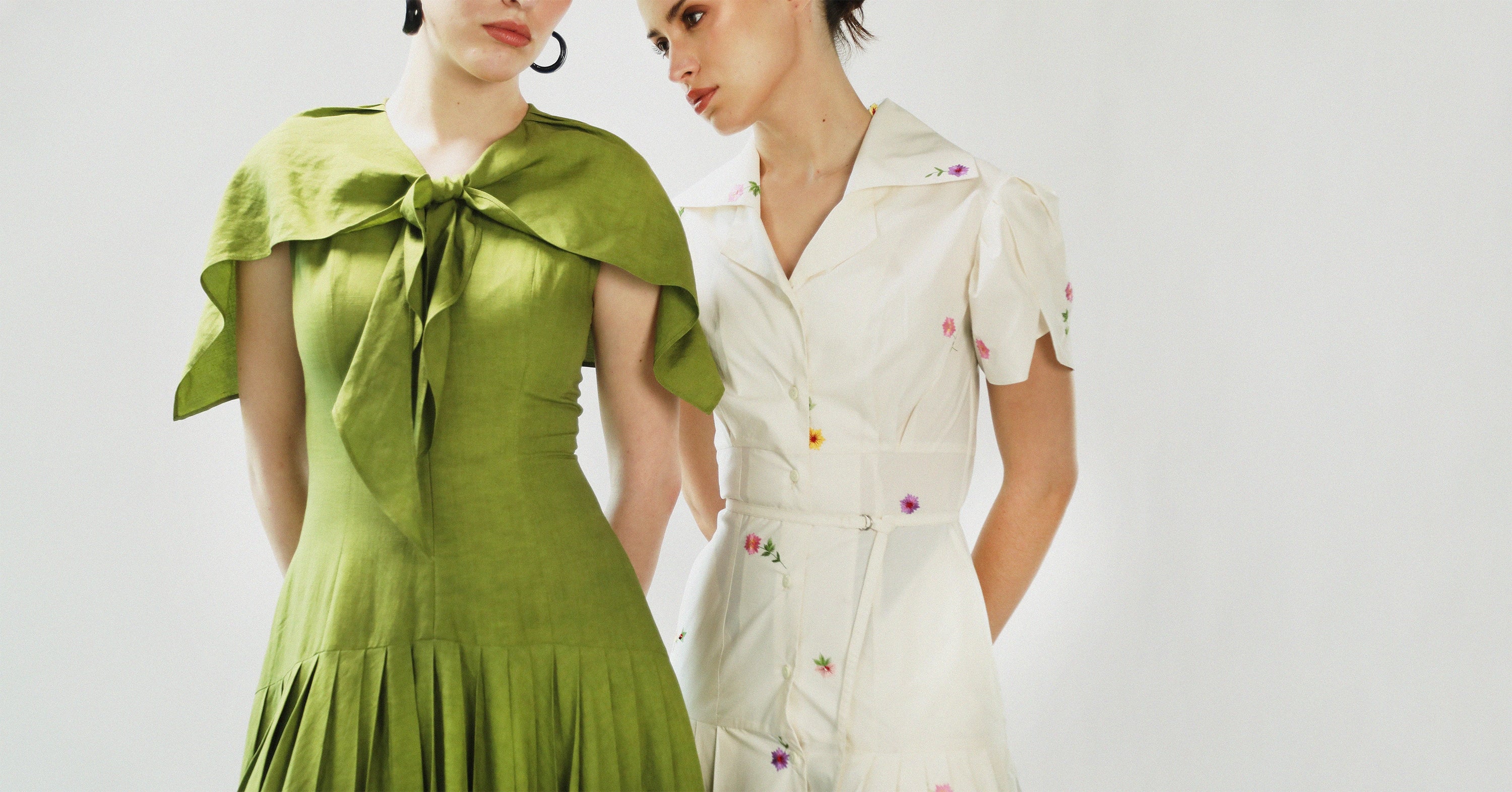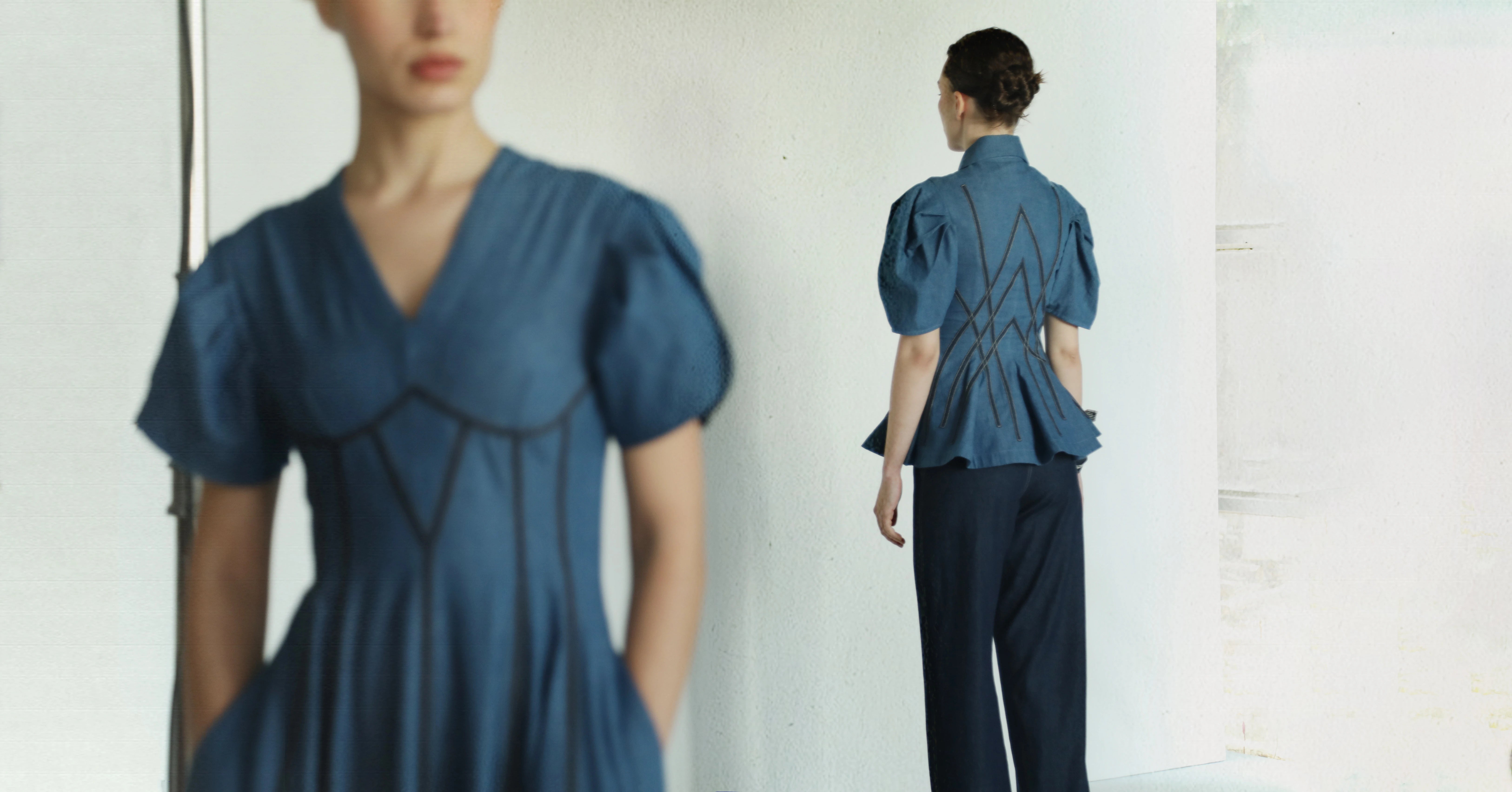 Softly sculpted forms emerge through refined fabric manipulation, shaping modern silhouettes defined by draped asymmetries and architectural balance. Dresses cut in panelled constructions fit like a glove through the contours before flaring into voluminous hems; lace-trimmed styles feature tailored seams; skirt and top coord-sets and a reinterpretation of an opera dress, rendered in Ruby and Raven, reveals a hint of skin through a lace overlay at the waistline, evoking sensuality in an elegant, timeless silhouette.