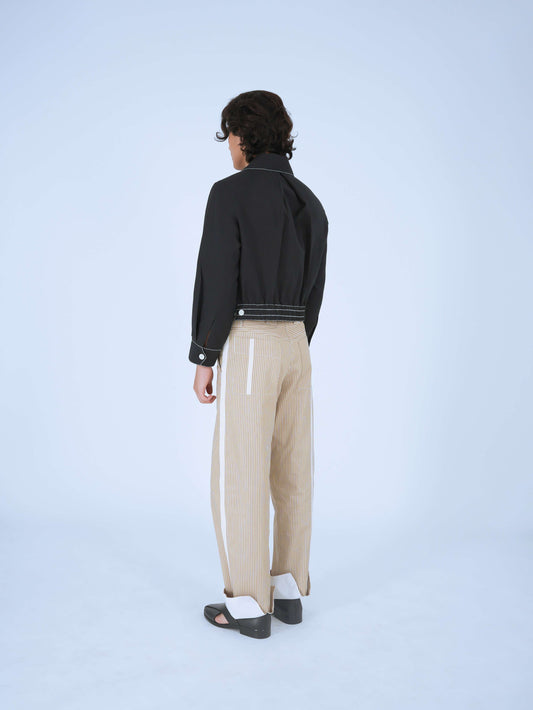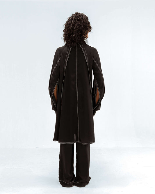 Hand-stitching articulates across both pieces—each seam visible evidence of human attention, each stitch a record of accumulated knowledge. Fabric and proportion speak together; this dialogue between pieces creates the impression of unified thought—that both components were conceived in relationship to each other rather than paired after separate creation.