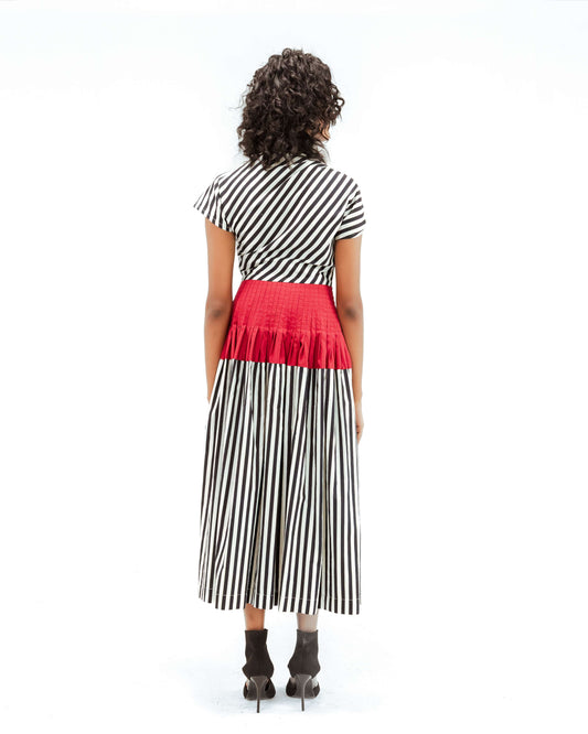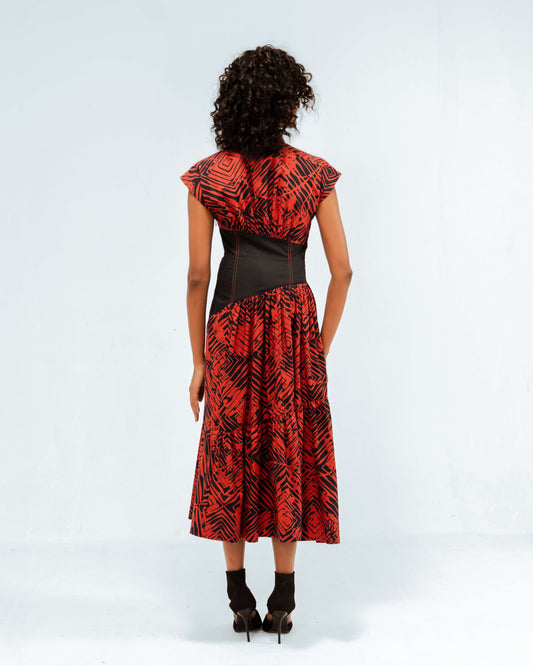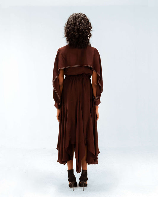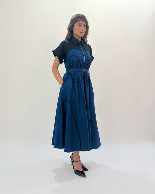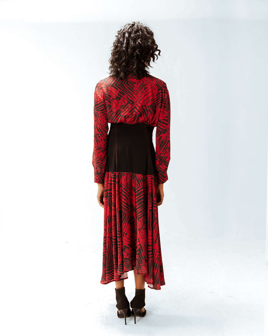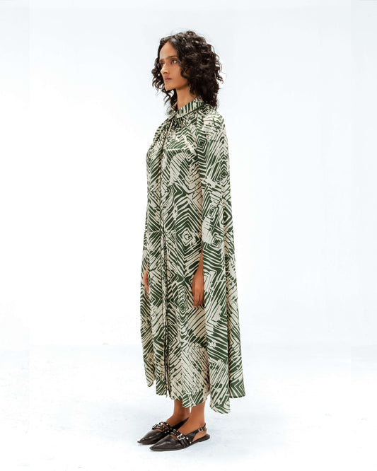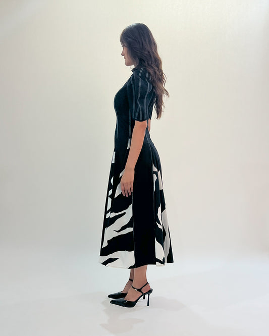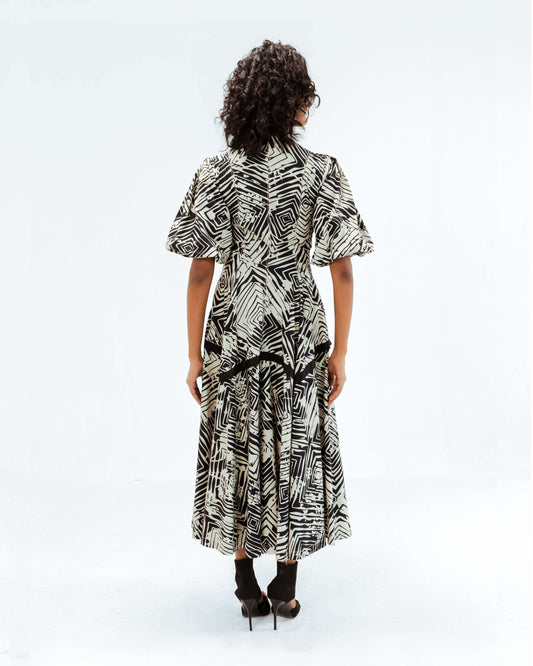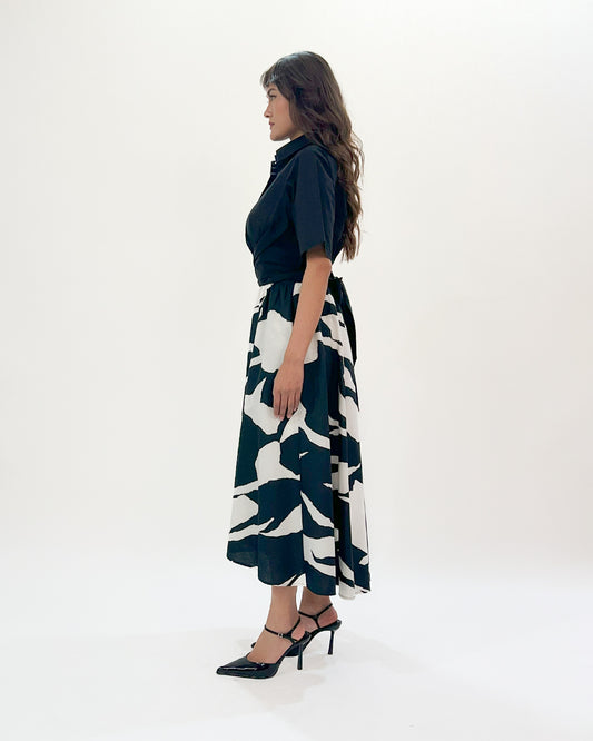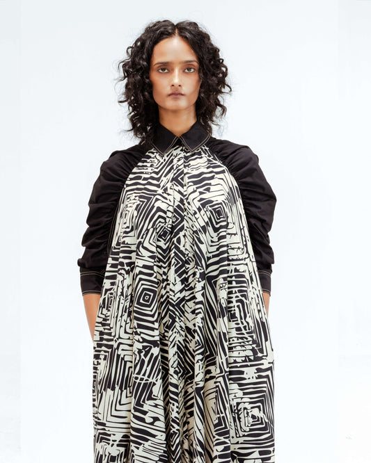 Panelled construction creates visual rhythm while allowing full range of movement—each panel functioning as both visual element and structural form. Draped asymmetries establish proportion through softness rather than rigidity, hems falling in directions that follow gravity. Botanical patterns, reimagined through sculptural perspective, suggest that traditional motifs carry contemporary meaning when encountered through modern sensibility.