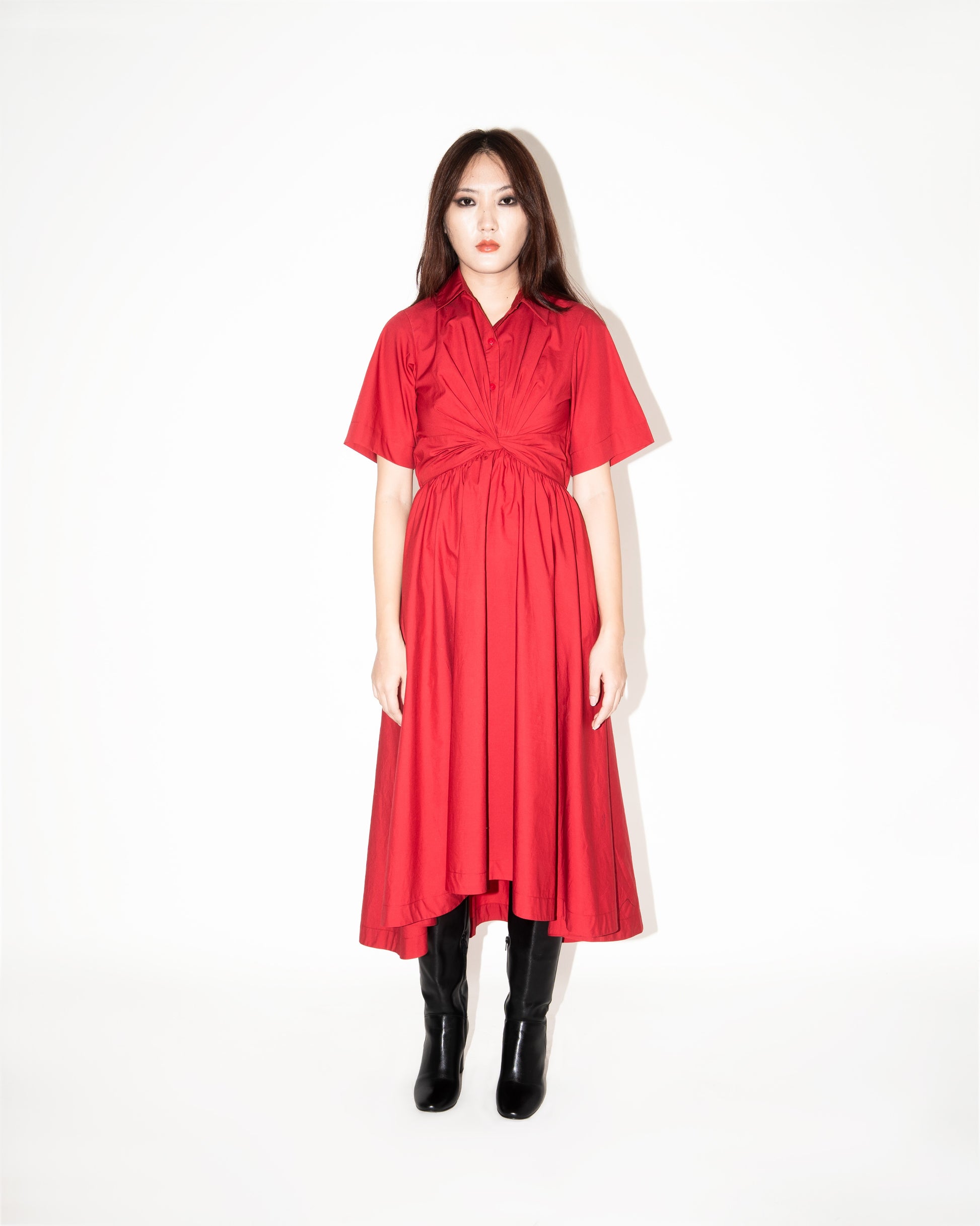 Twisted and draped at waist this high low dress is made of 100% cotton with front bodice placket. Model height is 5.8" Model wear size S garment length is 47"