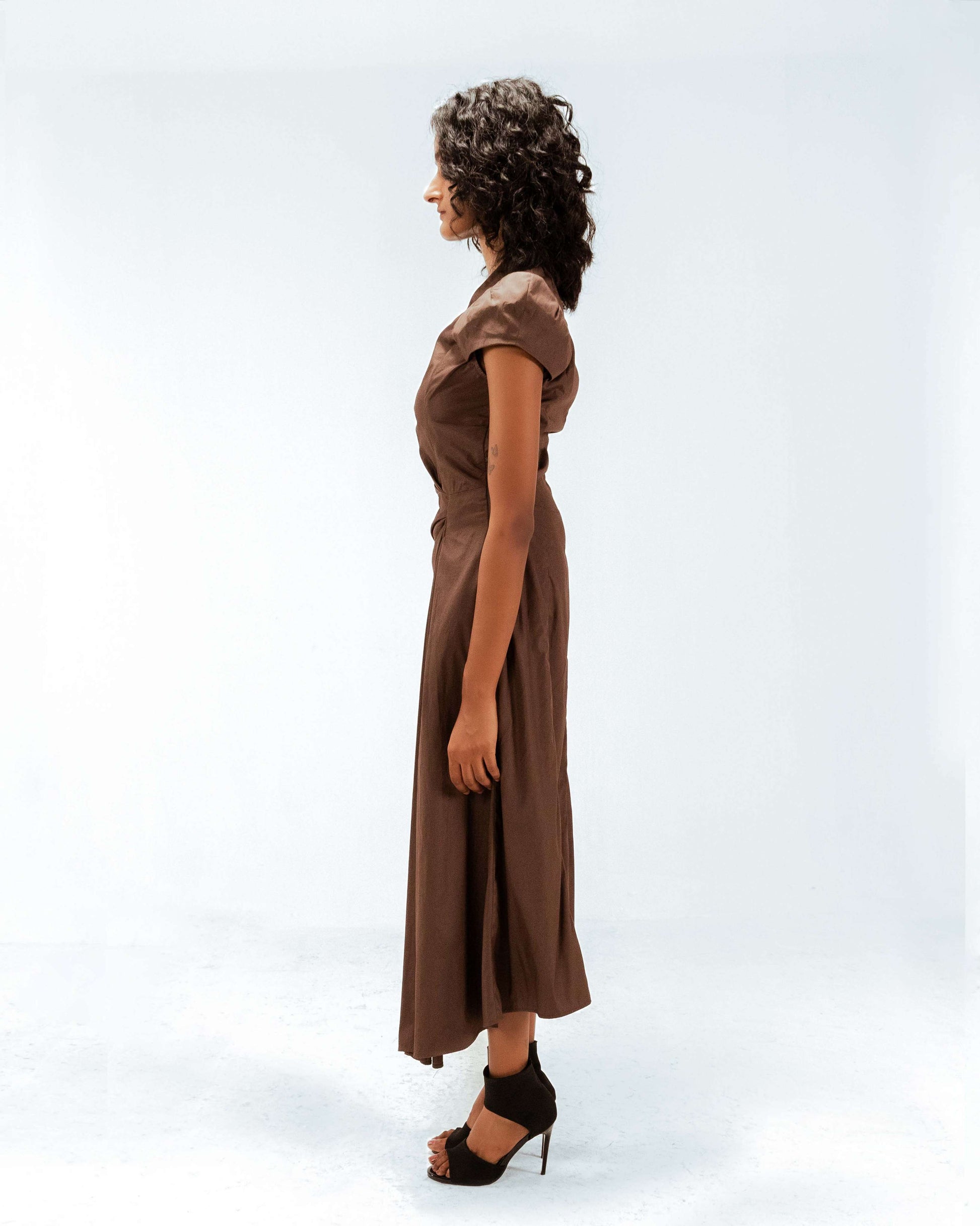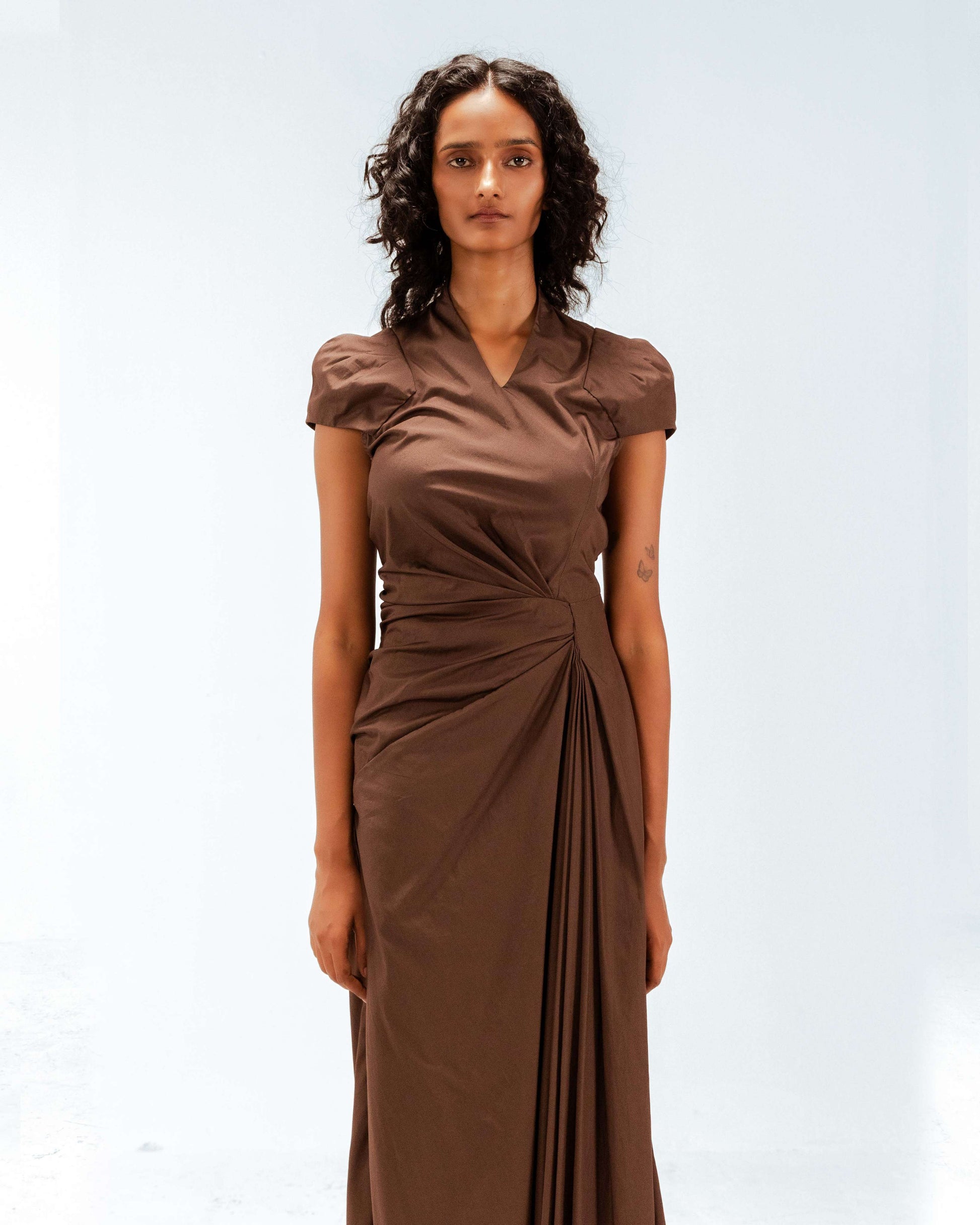 Precisely cut for a refined silhouette, this draped midi dress features sculpted cap dart sleeves that contour the shoulders with subtle structure. One-sided asymmetric pleats are expertly draped from the waist, adding depth and directional movement. Model Height is 5'9". Model wears size S. Garment length is 55"