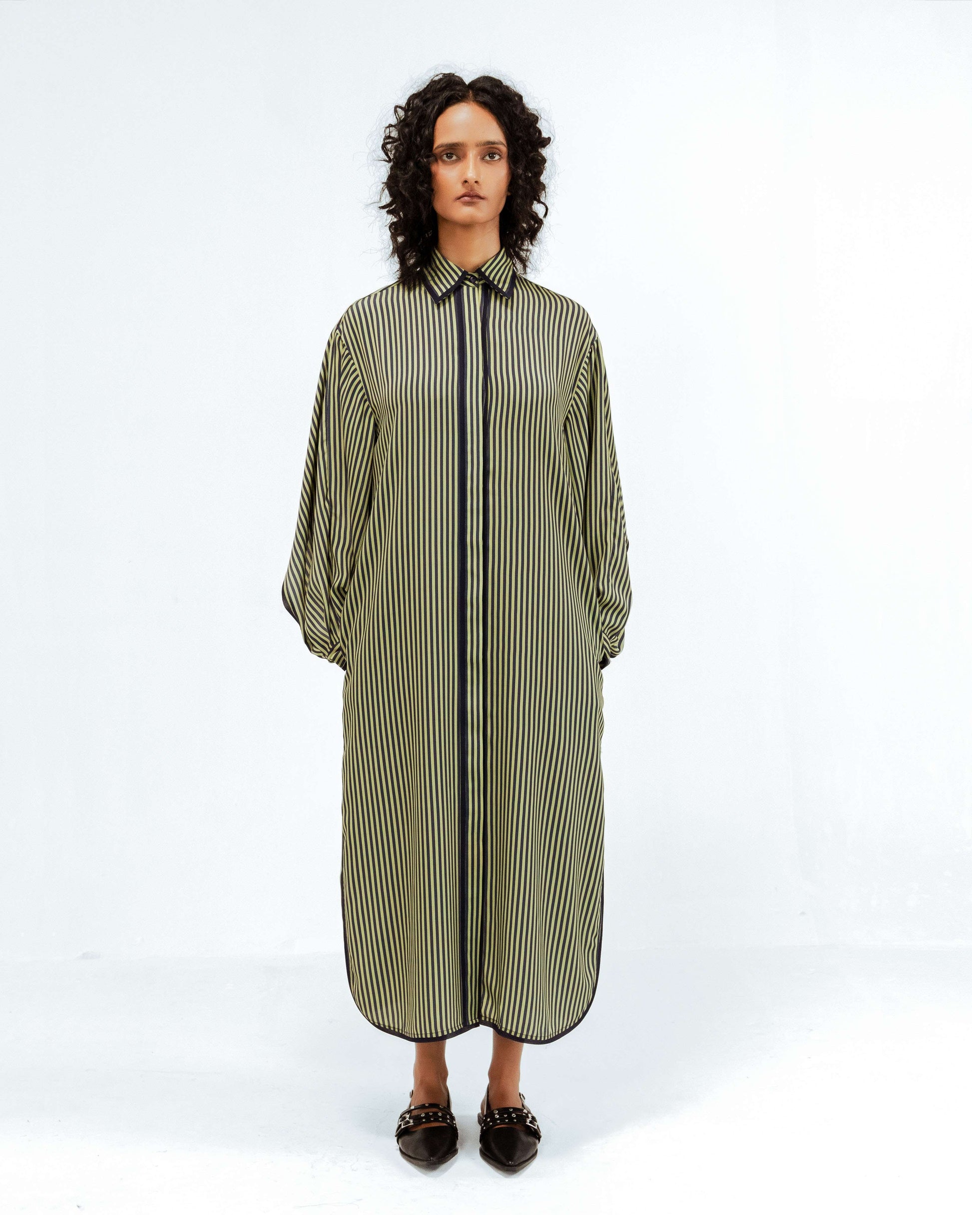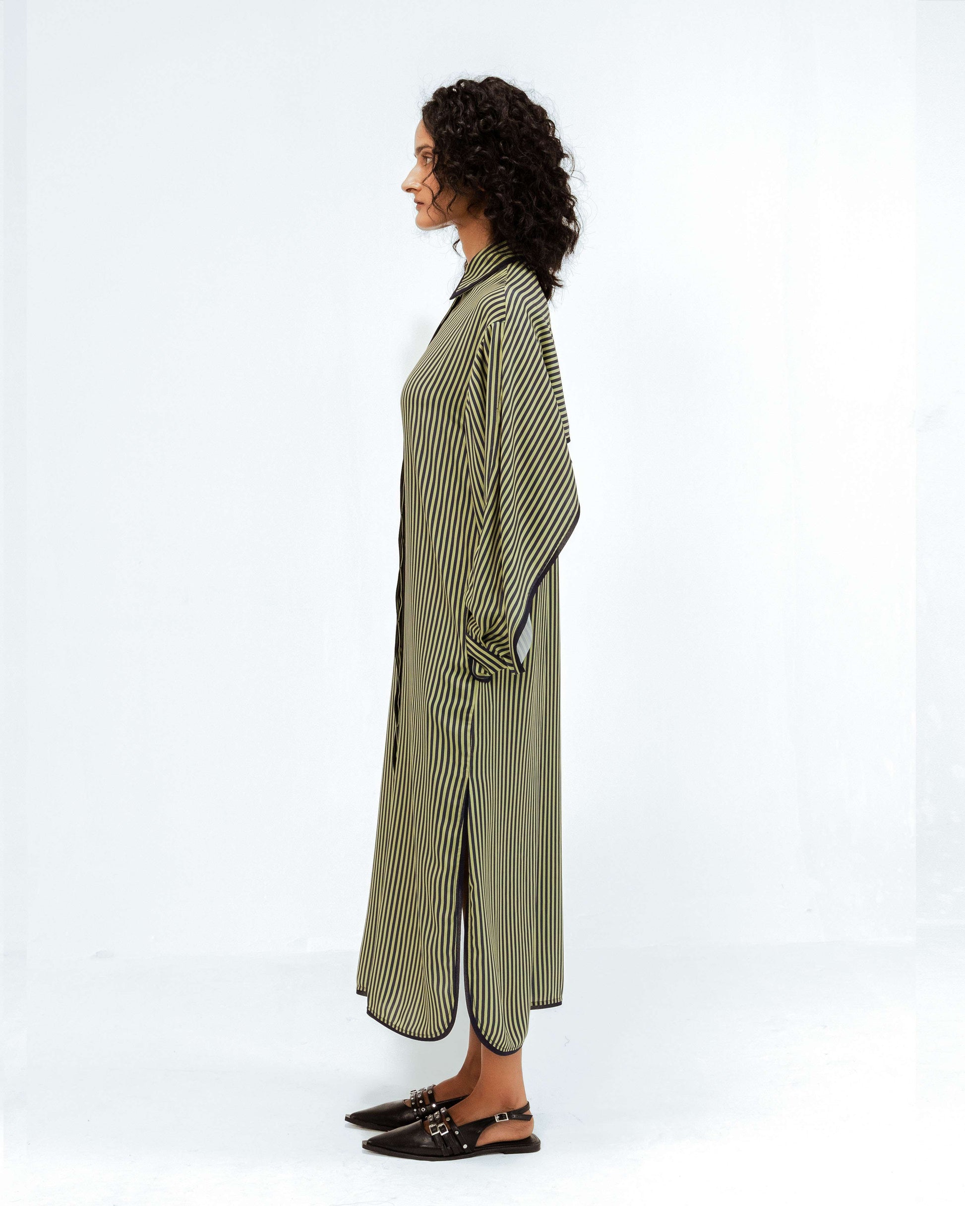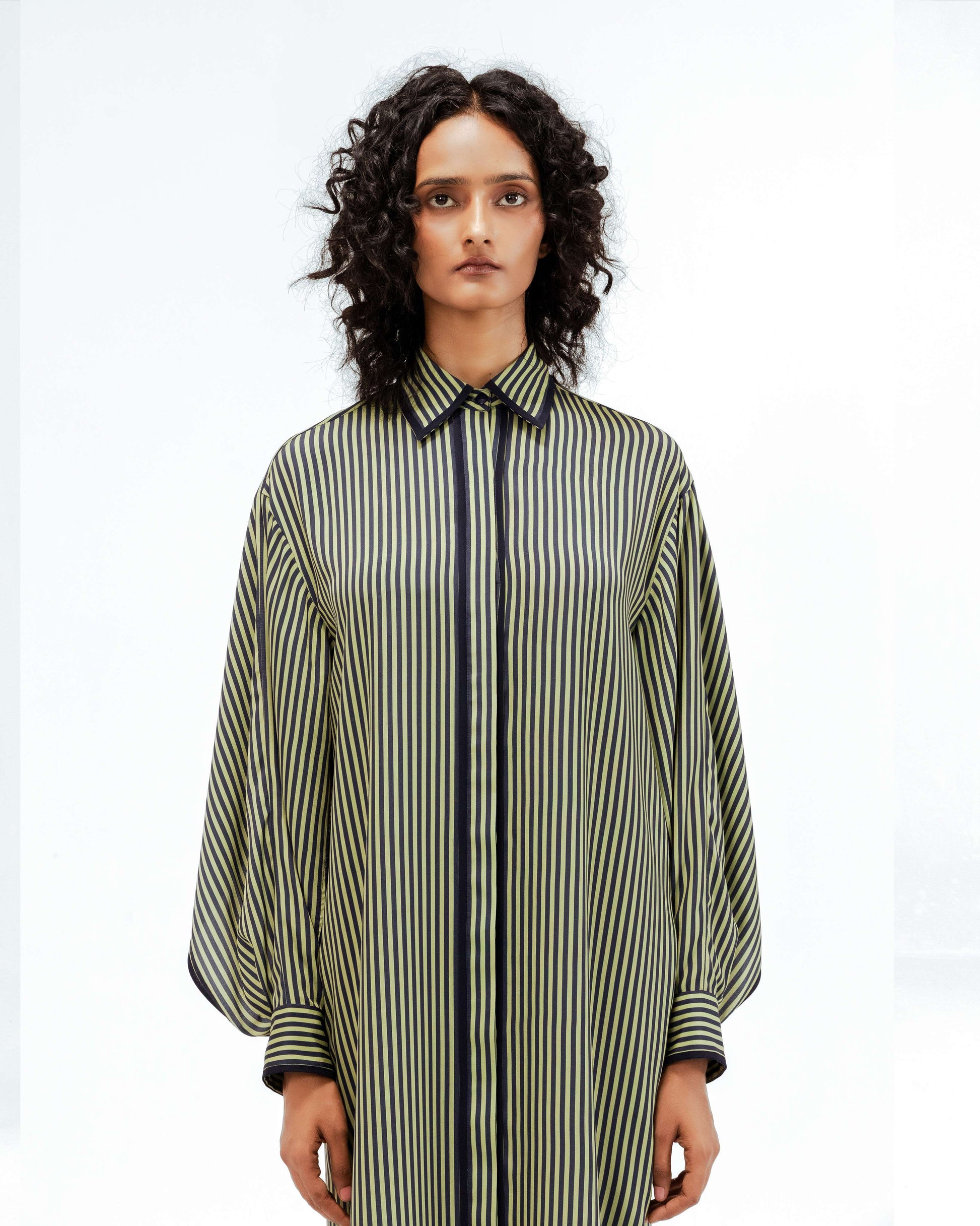 Precisely tailored in striped crepe, this shirt dress features open-yoked sleeves that introduce fluidity within a structured silhouette. The curved hemline adds a refined contour, while contrast piping highlights the construction lines with graphic precision. A contemporary take on classic shirting with a focus on form and detail. Model Height is 5'9". Model wears size S. Garment length is 50"
