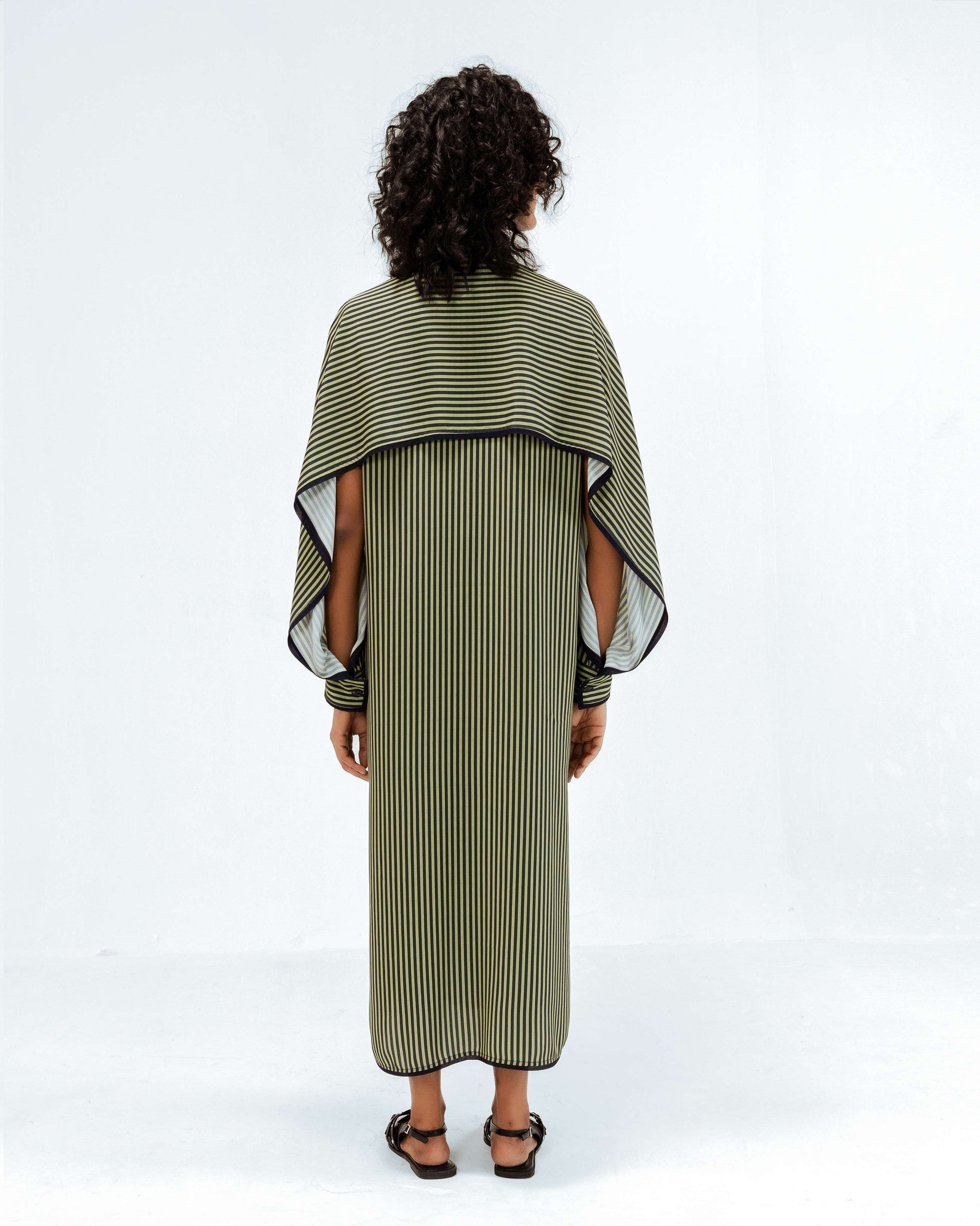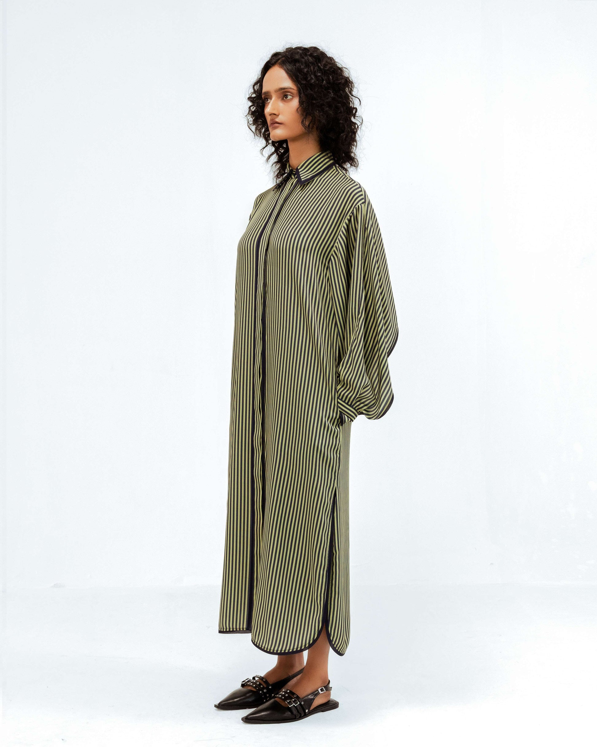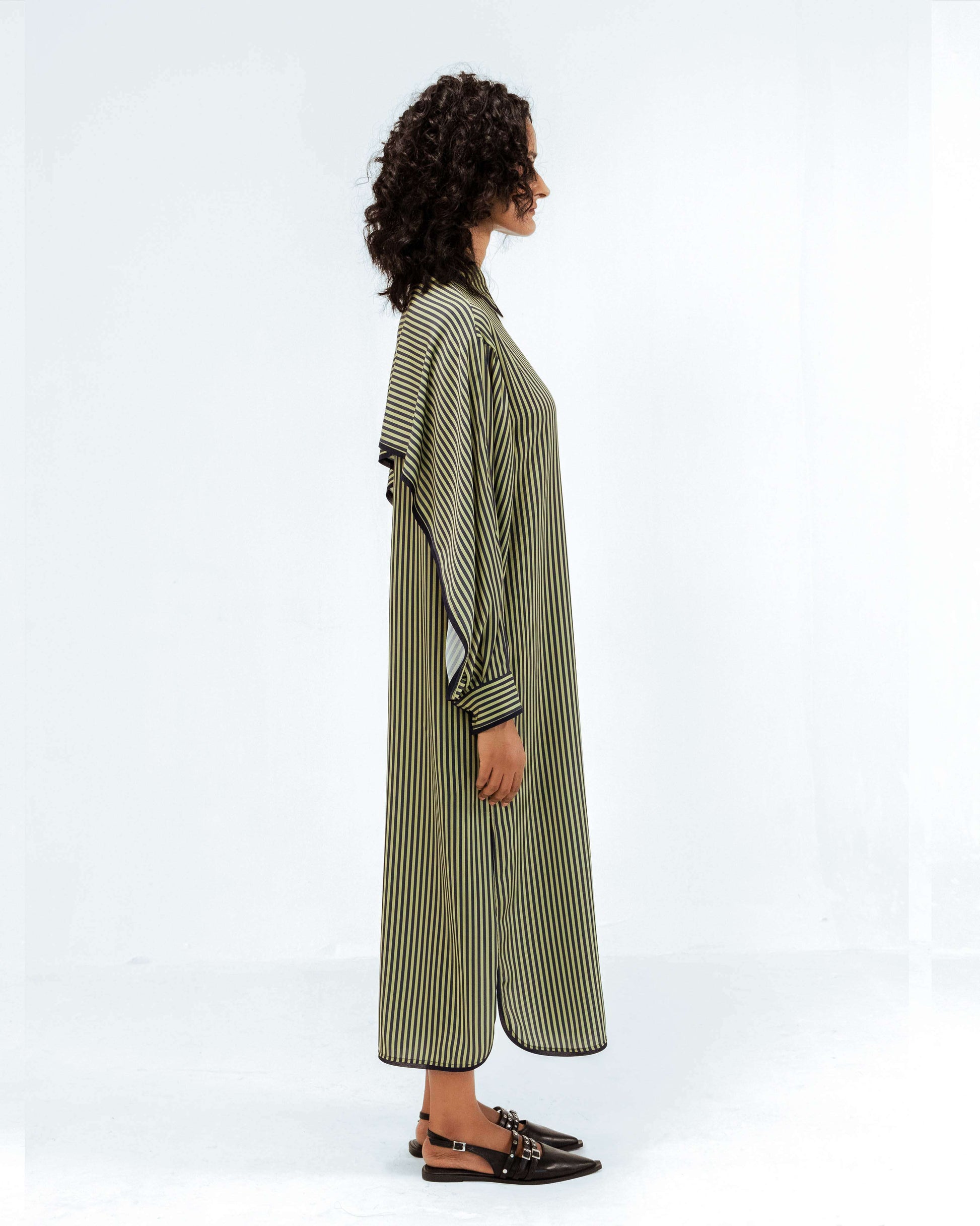 Precisely tailored in striped crepe, this shirt dress features open-yoked sleeves that introduce fluidity within a structured silhouette. The curved hemline adds a refined contour, while contrast piping highlights the construction lines with graphic precision. A contemporary take on classic shirting with a focus on form and detail. Model Height is 5'9". Model wears size S. Garment length is 50"