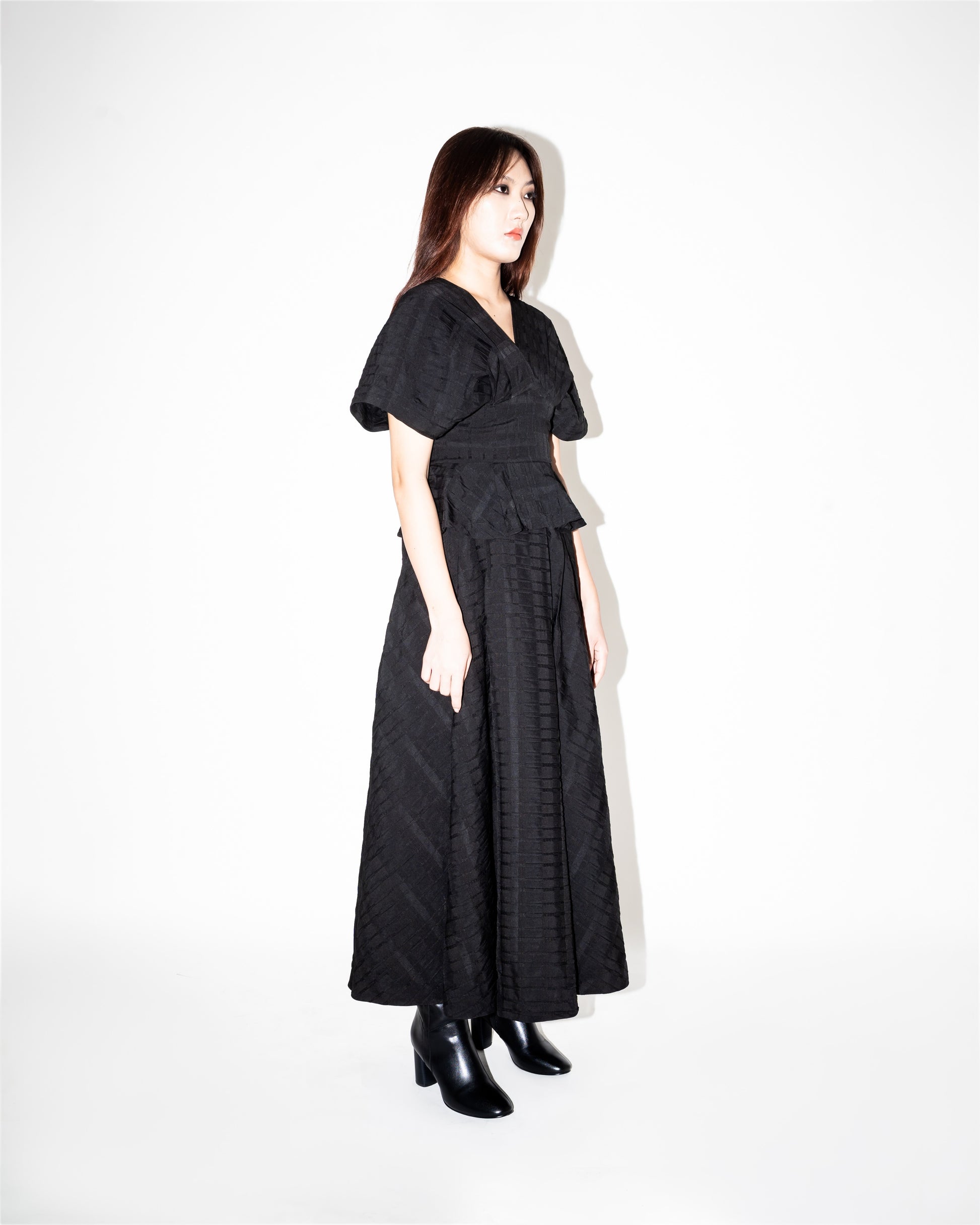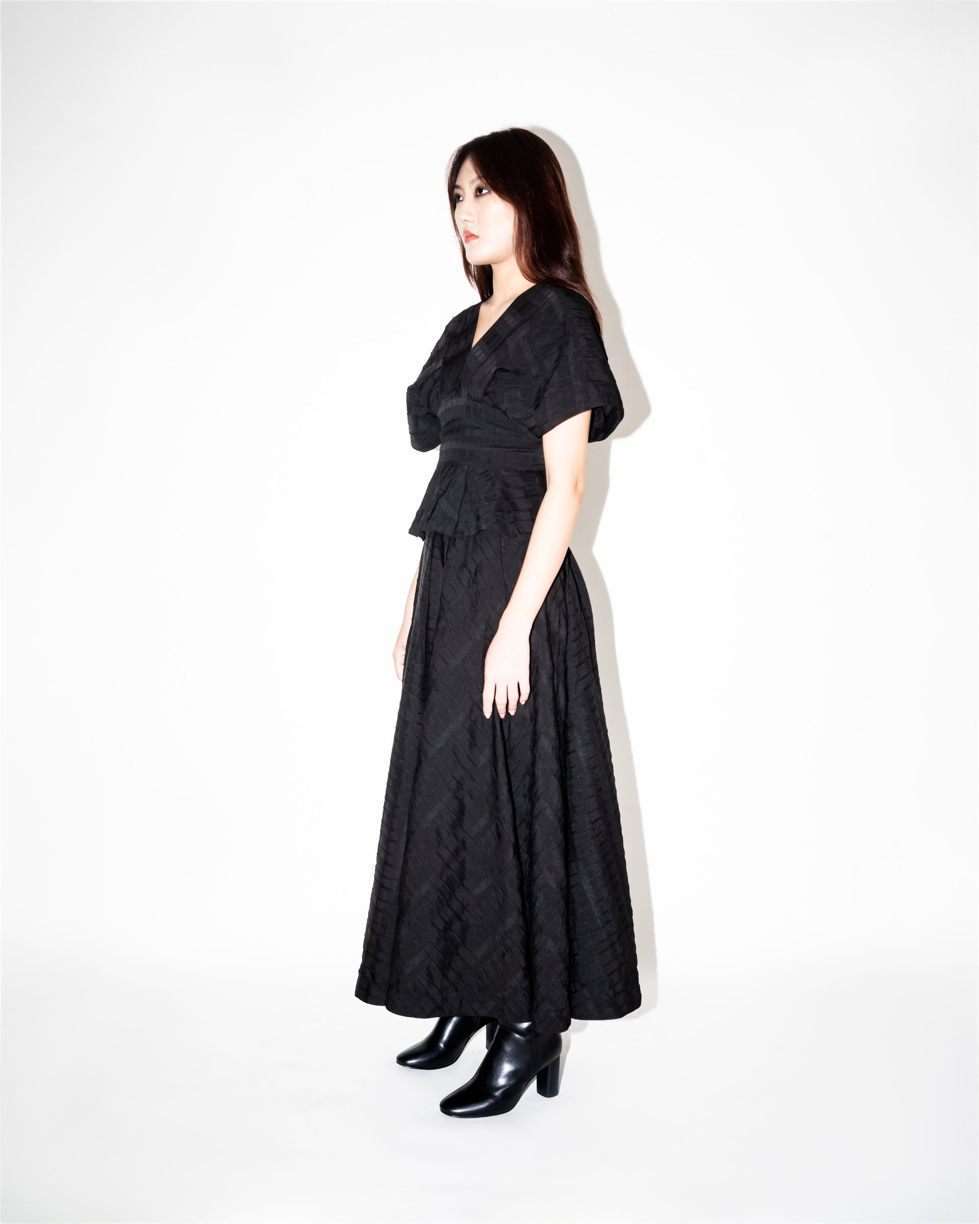 Pleated bodice with extended sleeves and fitted at waist with back elastic for comfort this peplum top is made of textured taffeta finished off with back zipper. Model height is 5.8" Model wear size S garment length is 21"