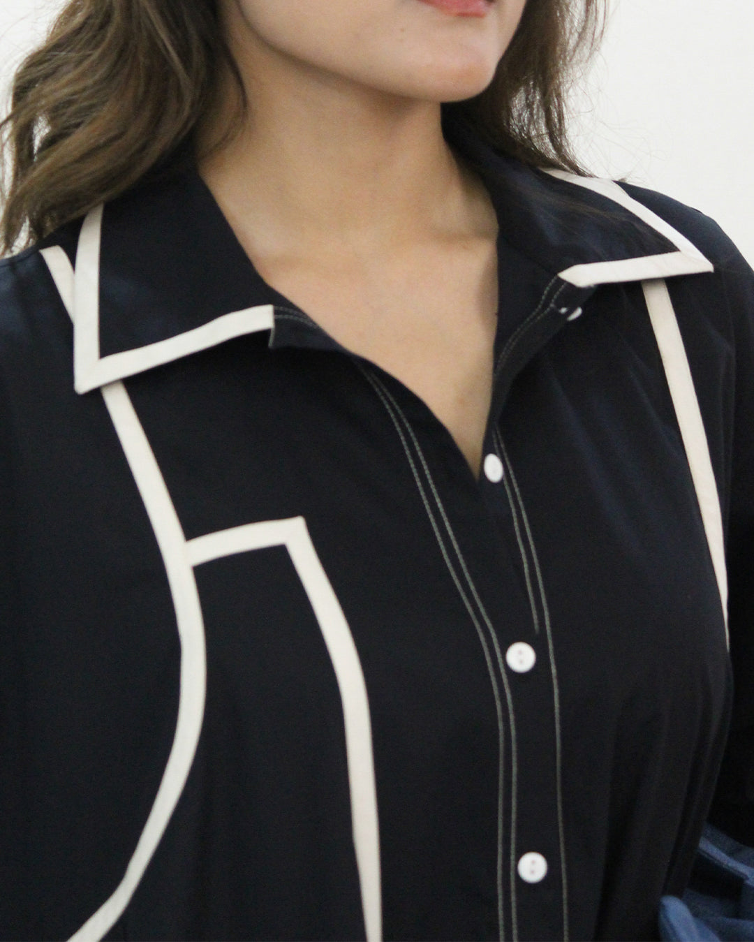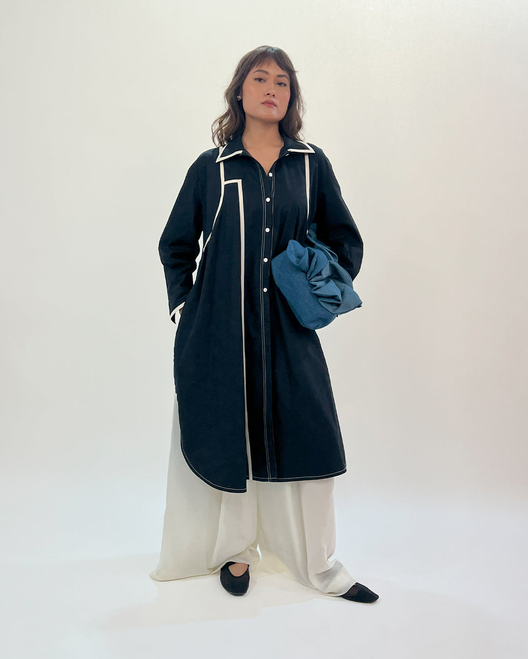 This long shirt dress combines clean lines with subtle design details for a refined look. It features side plackets that create a sleek, functional detail, with curved hemline. The contrast curved tapes with slight gathers that introduce a relaxed, comfortable element. Enhancing the overall look with contrast tapes on the collar and cuffs, offering a crisp, polished finish. Model wear size S model height is 5'8 garment length is 45"