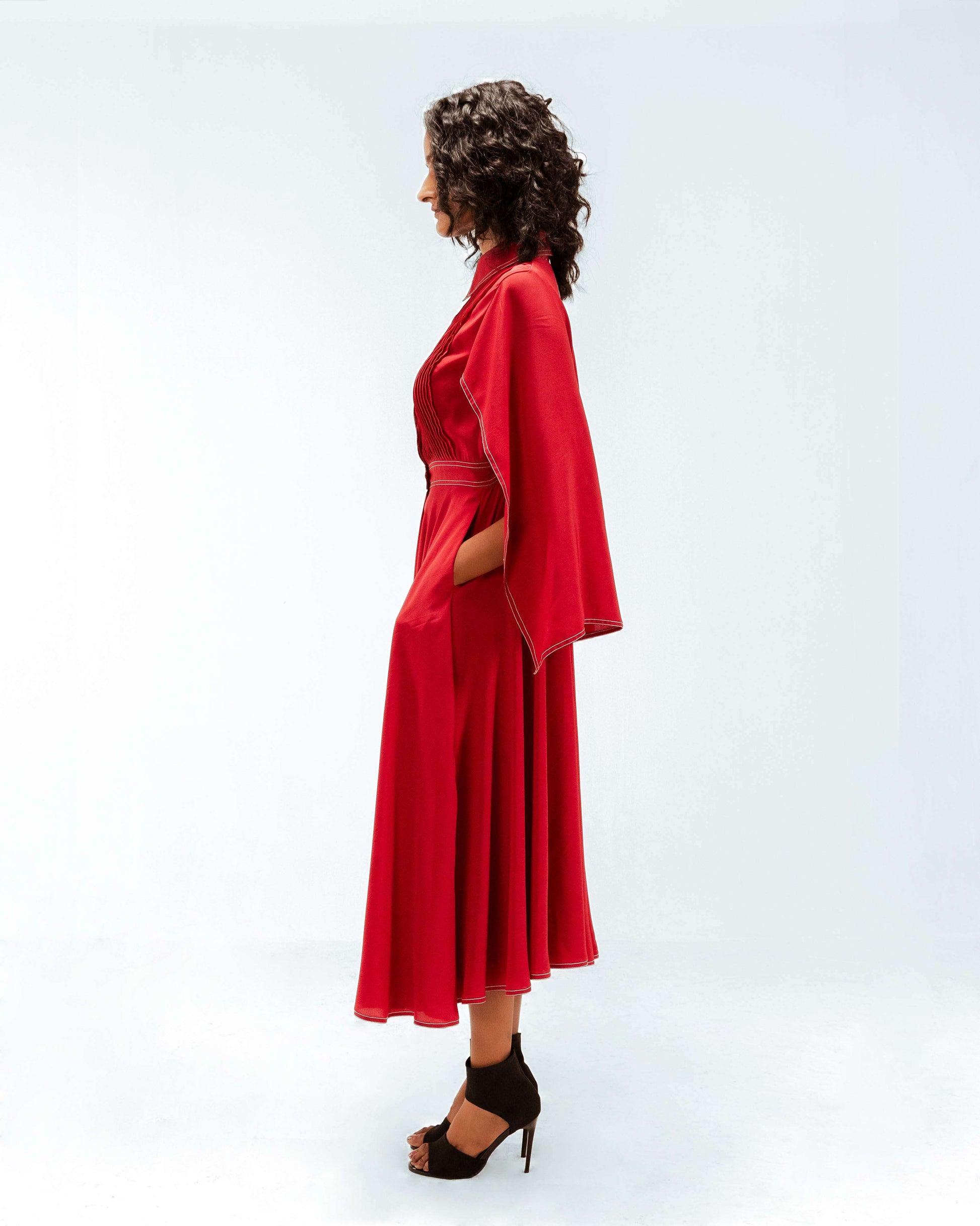 Made in fluid crepe, this midi dress features graceful shawl sleeves and delicate pleat detailing on the bodice. A belted waist with an elasticated back ensures a comfortable, flattering fit, while the circular skirt adds a sense of movement. Finished with contrast stitching throughout, the dress blends soft structure with thoughtful detailing. Model Height is 5'9". Model wears size S. Garment length is 50"