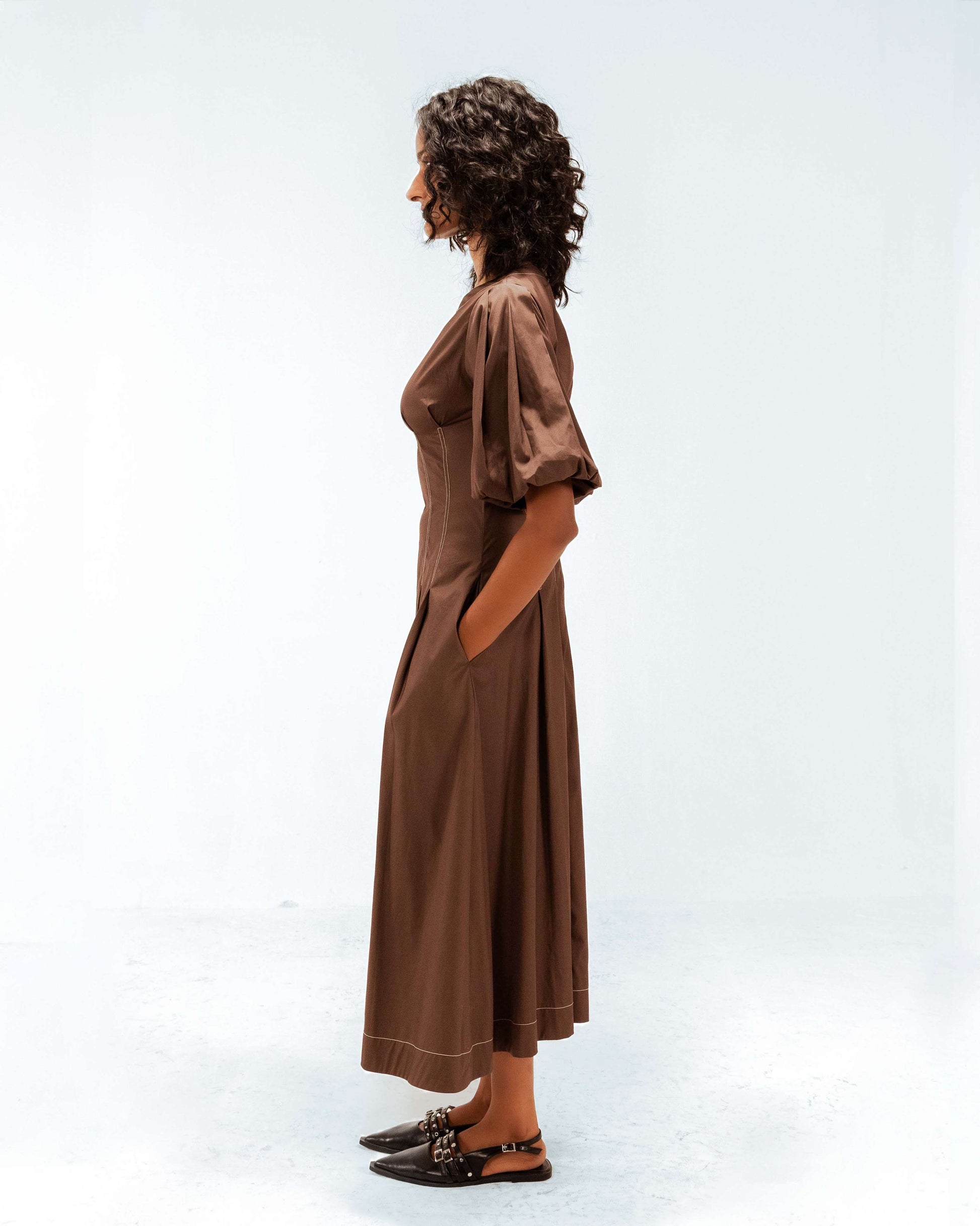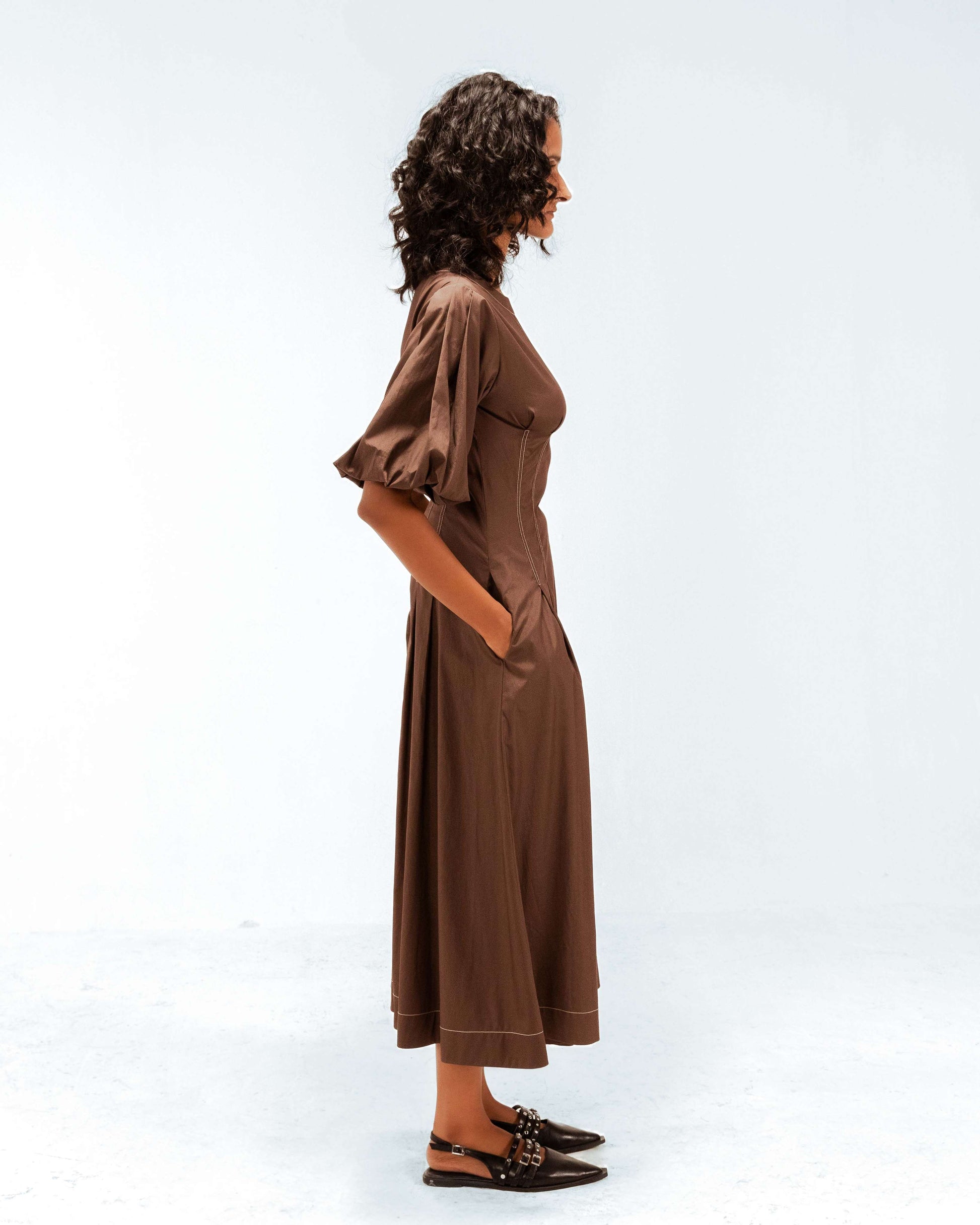 Crafted in breathable cotton, this midi dress features pleat darts at the waist for subtle shaping and definition. Contrast stitch details highlight the construction, while the bubble hem sleeves are finished with delicate pleat accents, adding volume. Model Height is 5'9". Model wears size S. Garment length is 50"