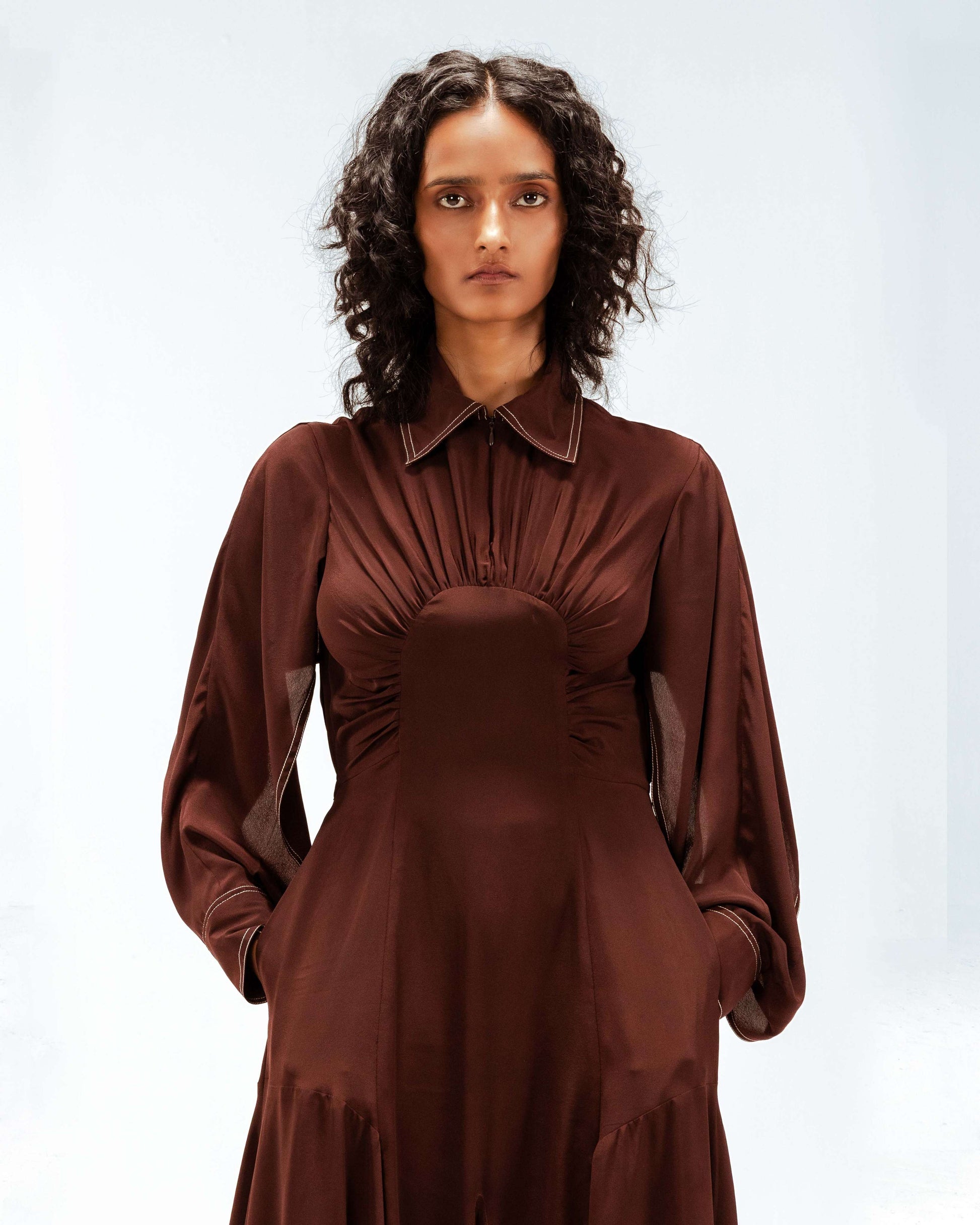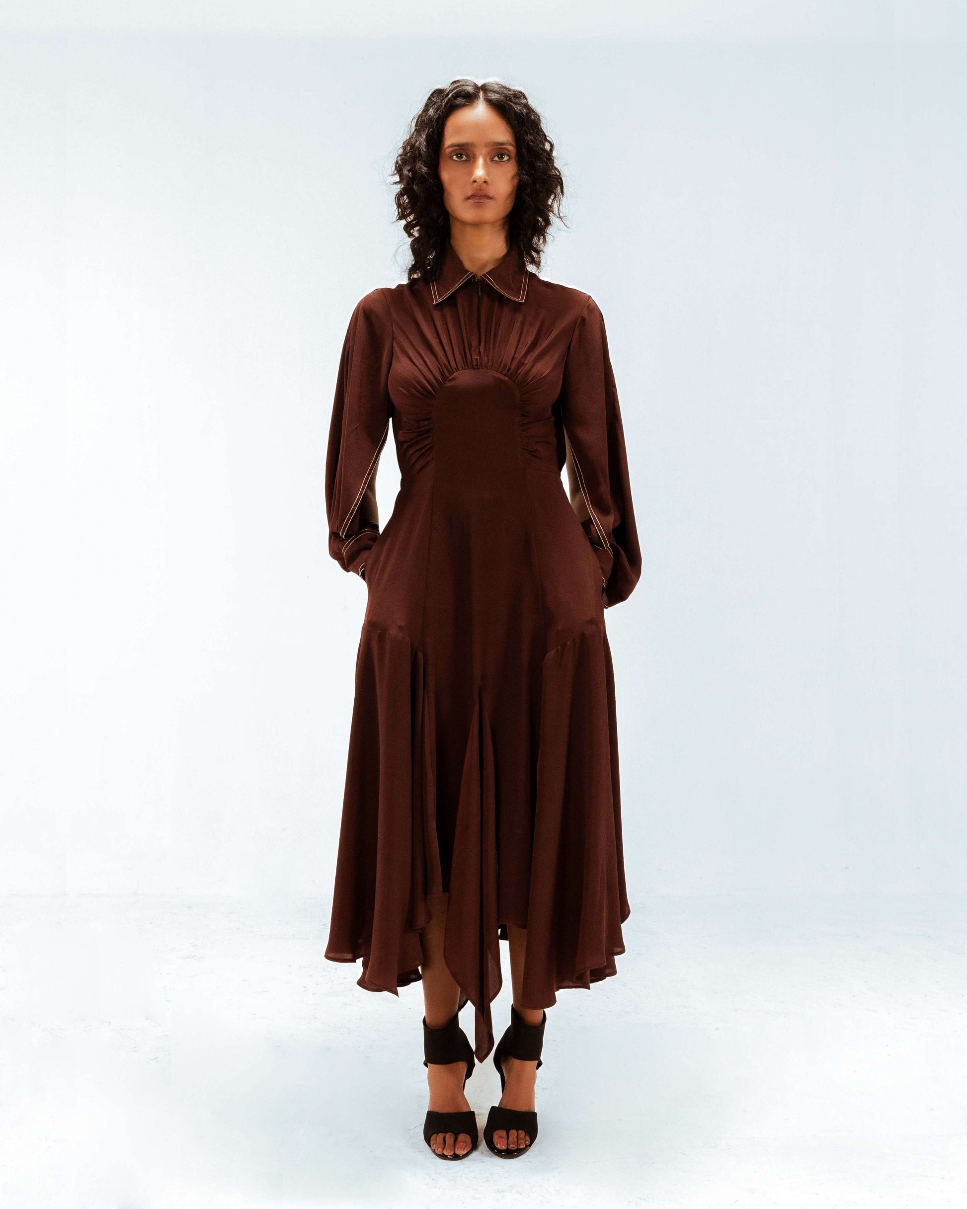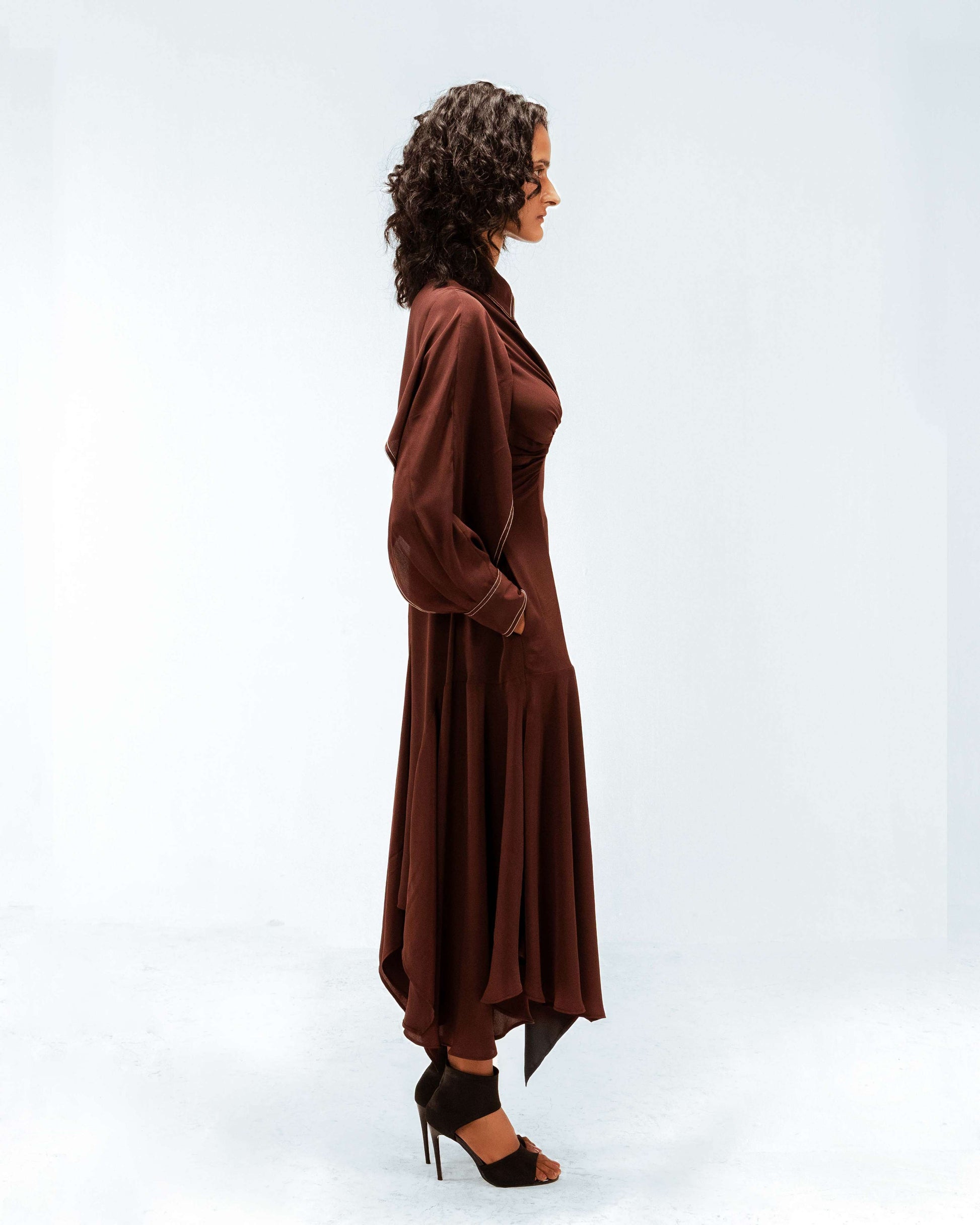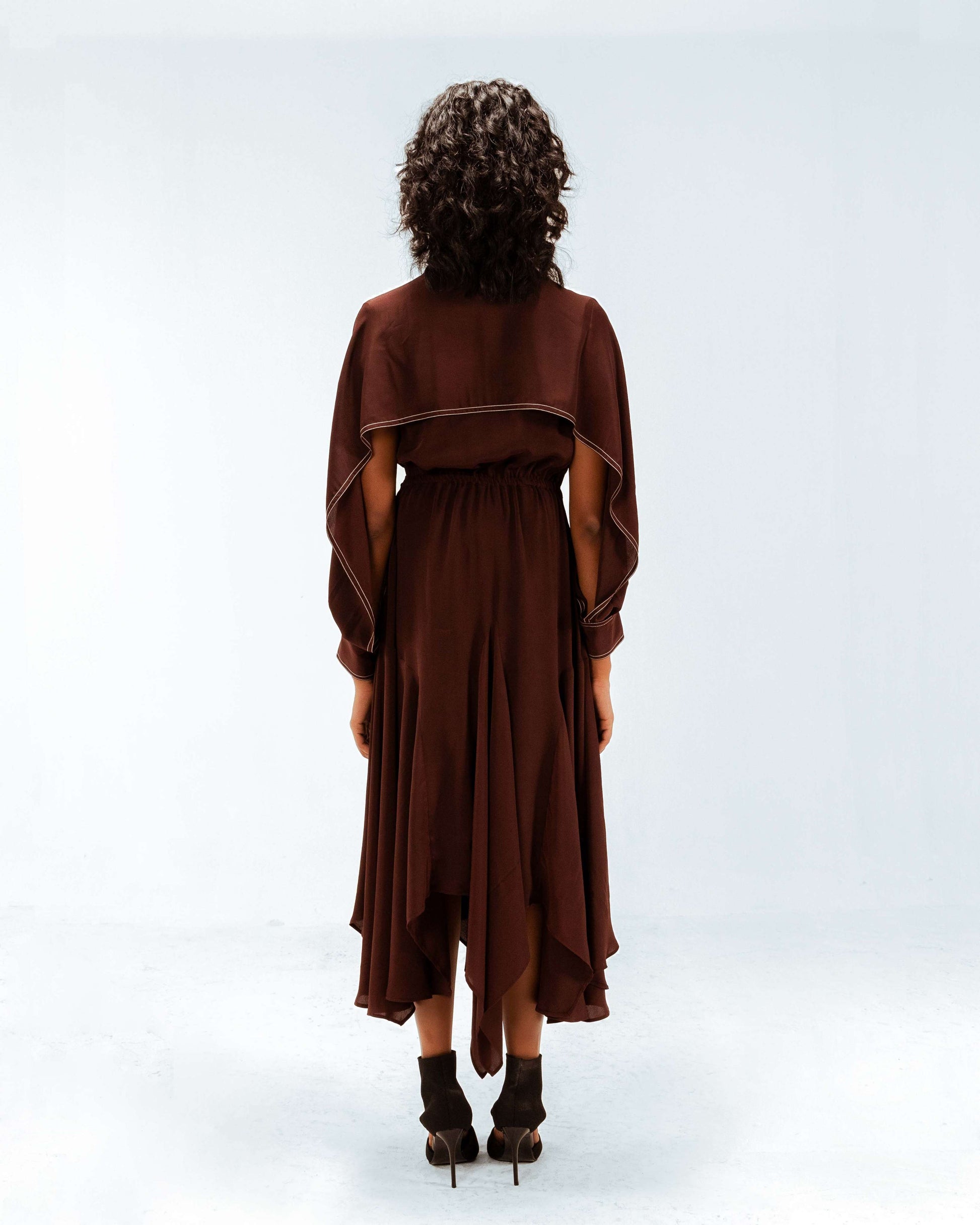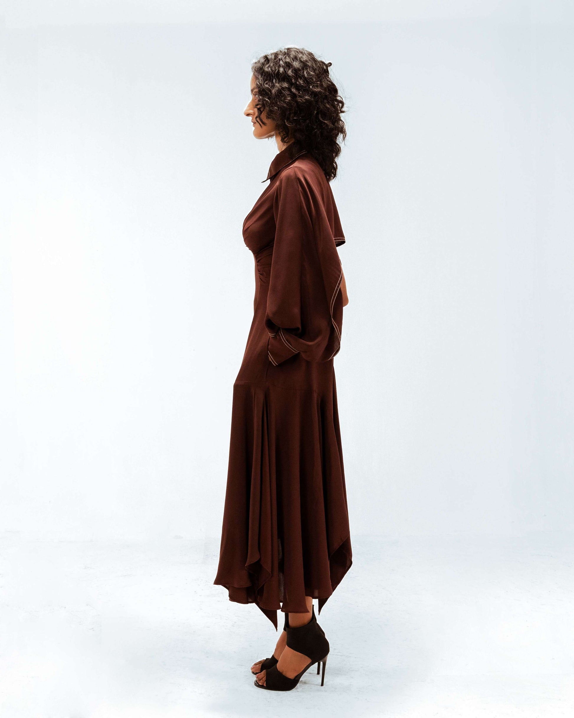 Tailored in fluid crepe, this midi dress features a precisely engineered center curved panel that sculpts the silhouette with subtle definition. Open-yoked sleeves fall into controlled, flowy drapes, adding a refined softness to the structured form. Finished with an asymmetric handkerchief hem and sharp contrast stitch detailing. Model Height is 5'9". Model wears size S. Garment length is 55"