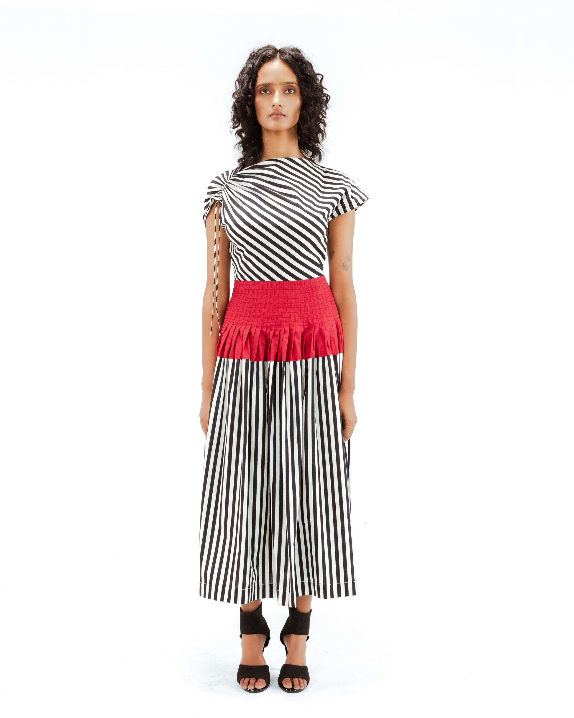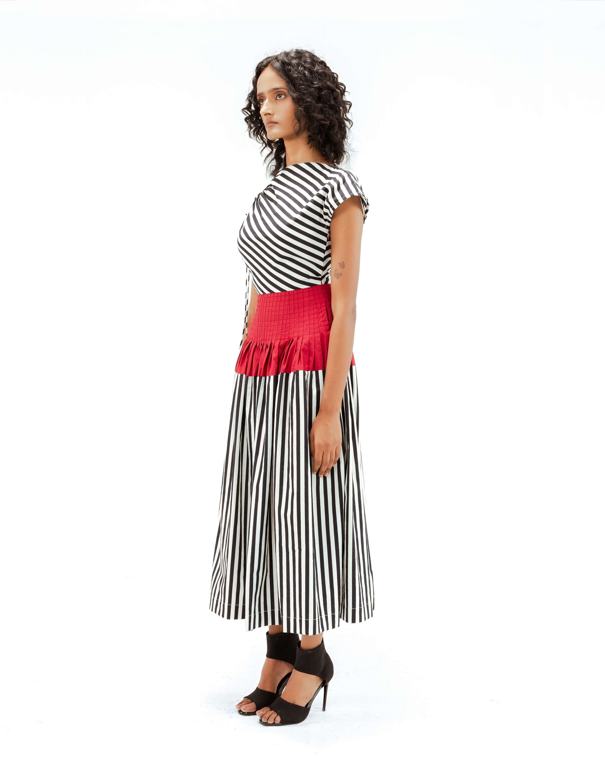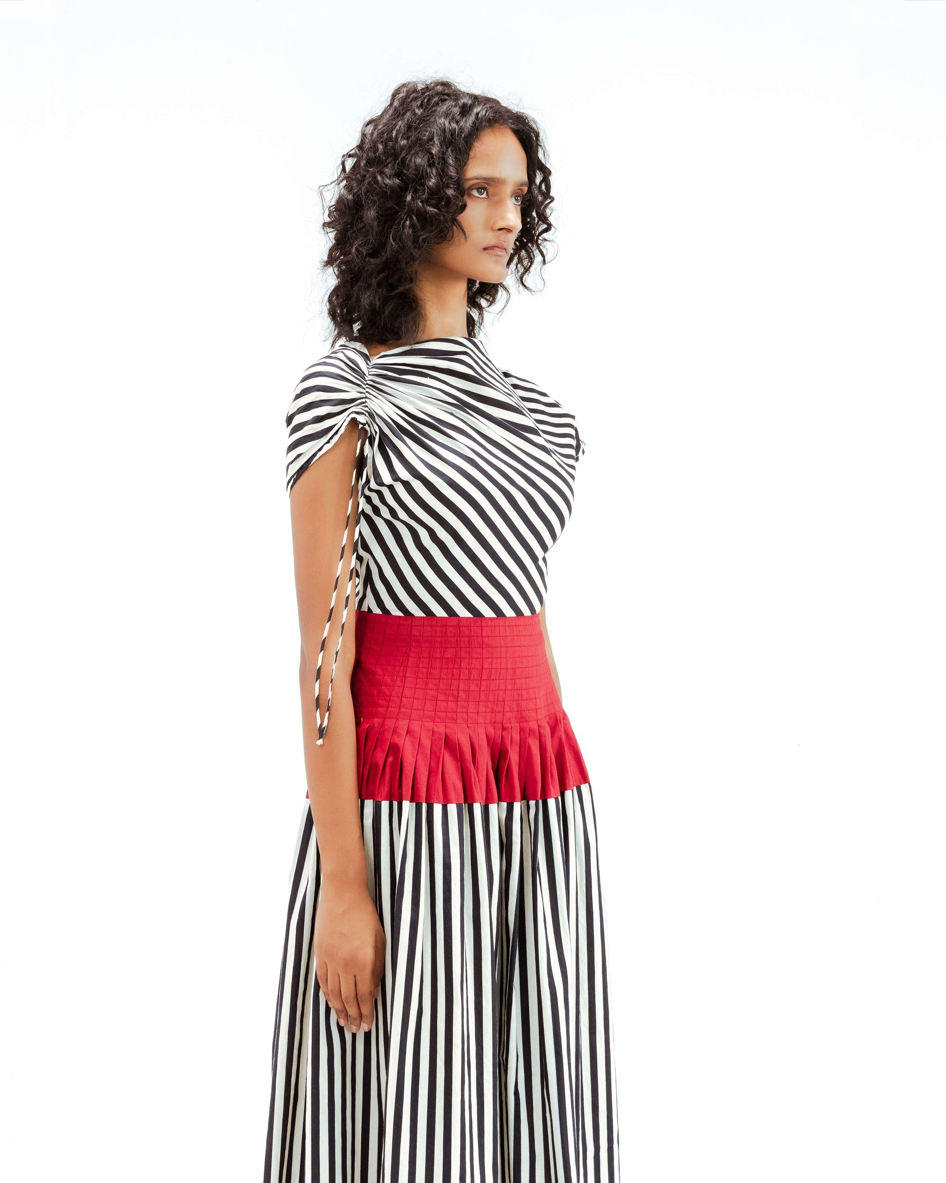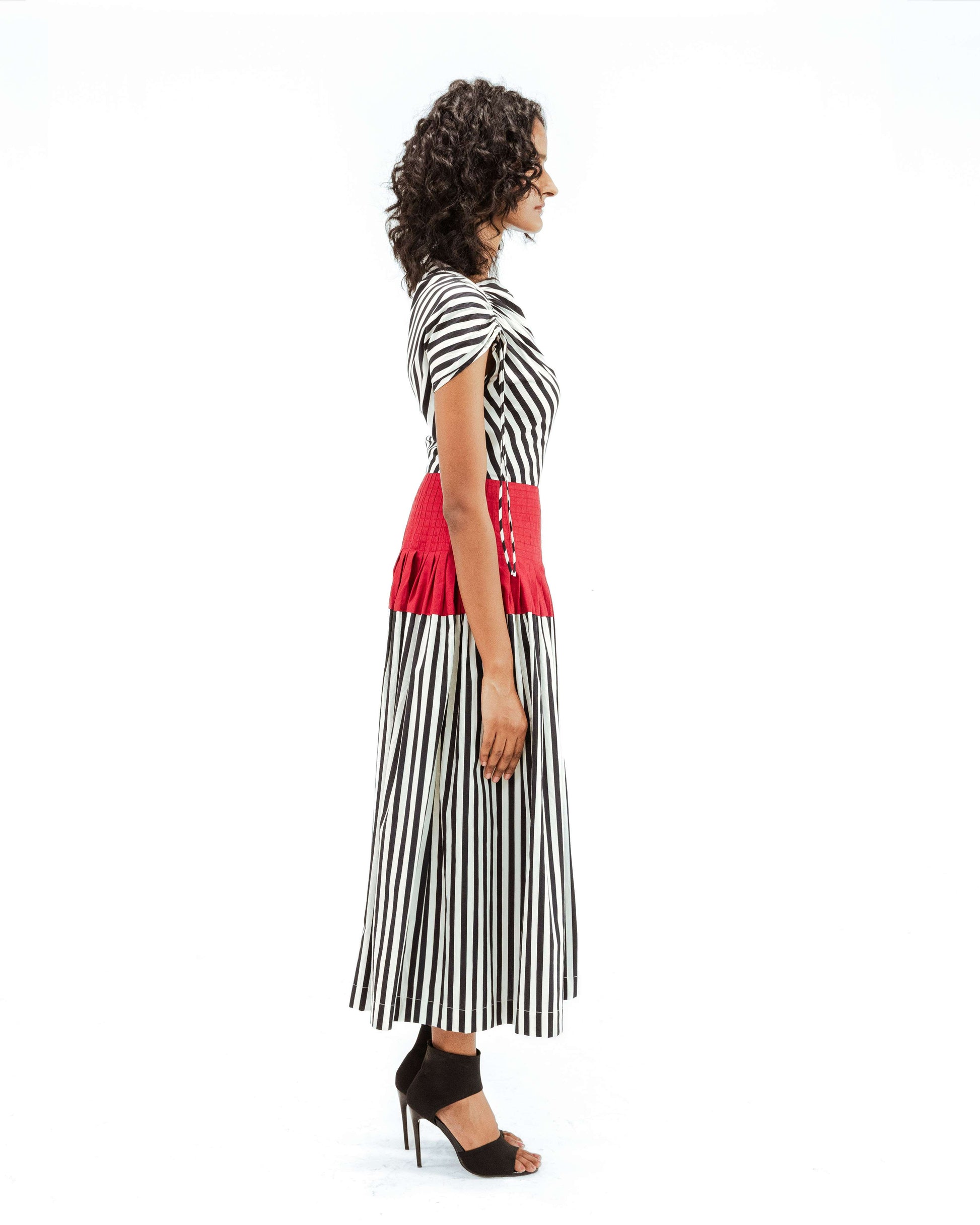 Crafted in striped cotton, this midi dress features an artful play of structure and fluidity with an asymmetric neckline ruched and draped on one side, the other a relaxed drop shoulder. The contrast waist panel is cinched with soft pleats and elevated by topstitch detailing, creating a silhouette that feels both sculptural and effortless. Model Height is 5'9". Model wears size S. Garment length is 50"