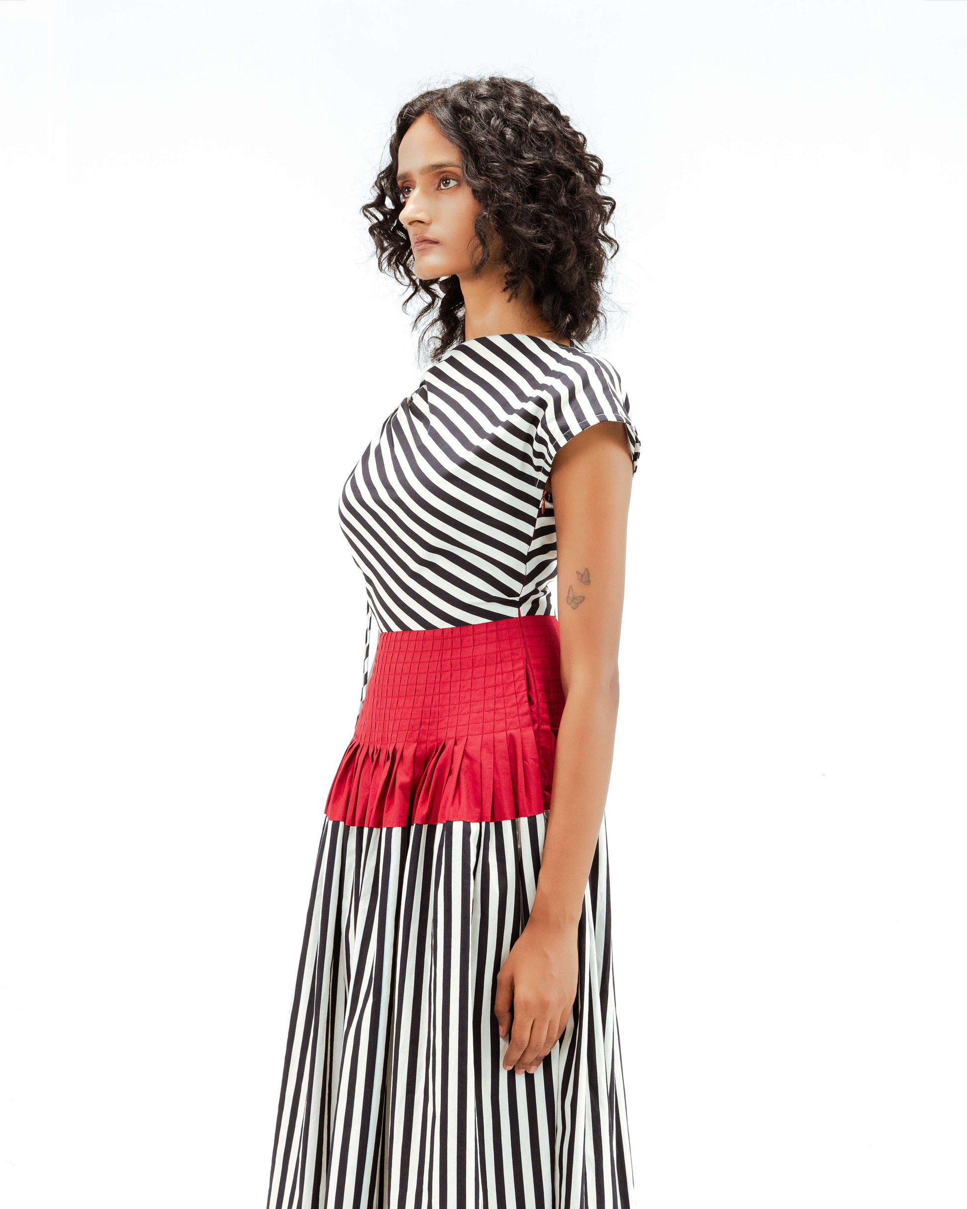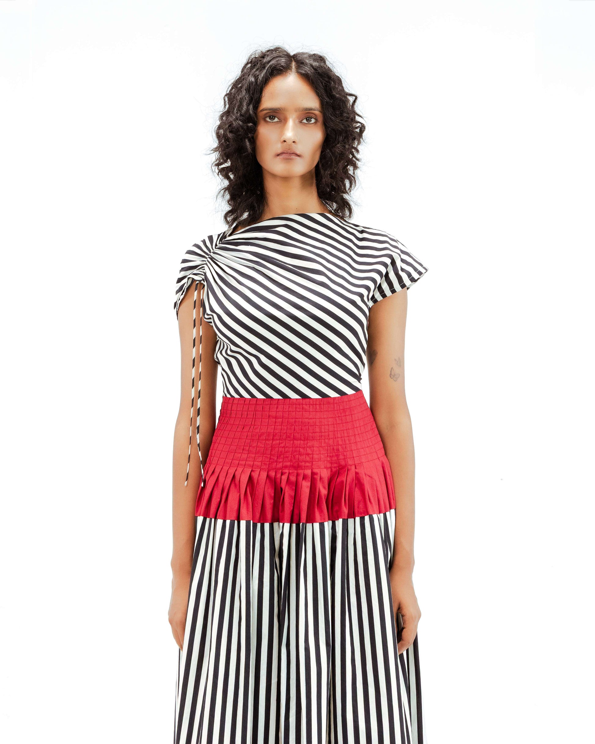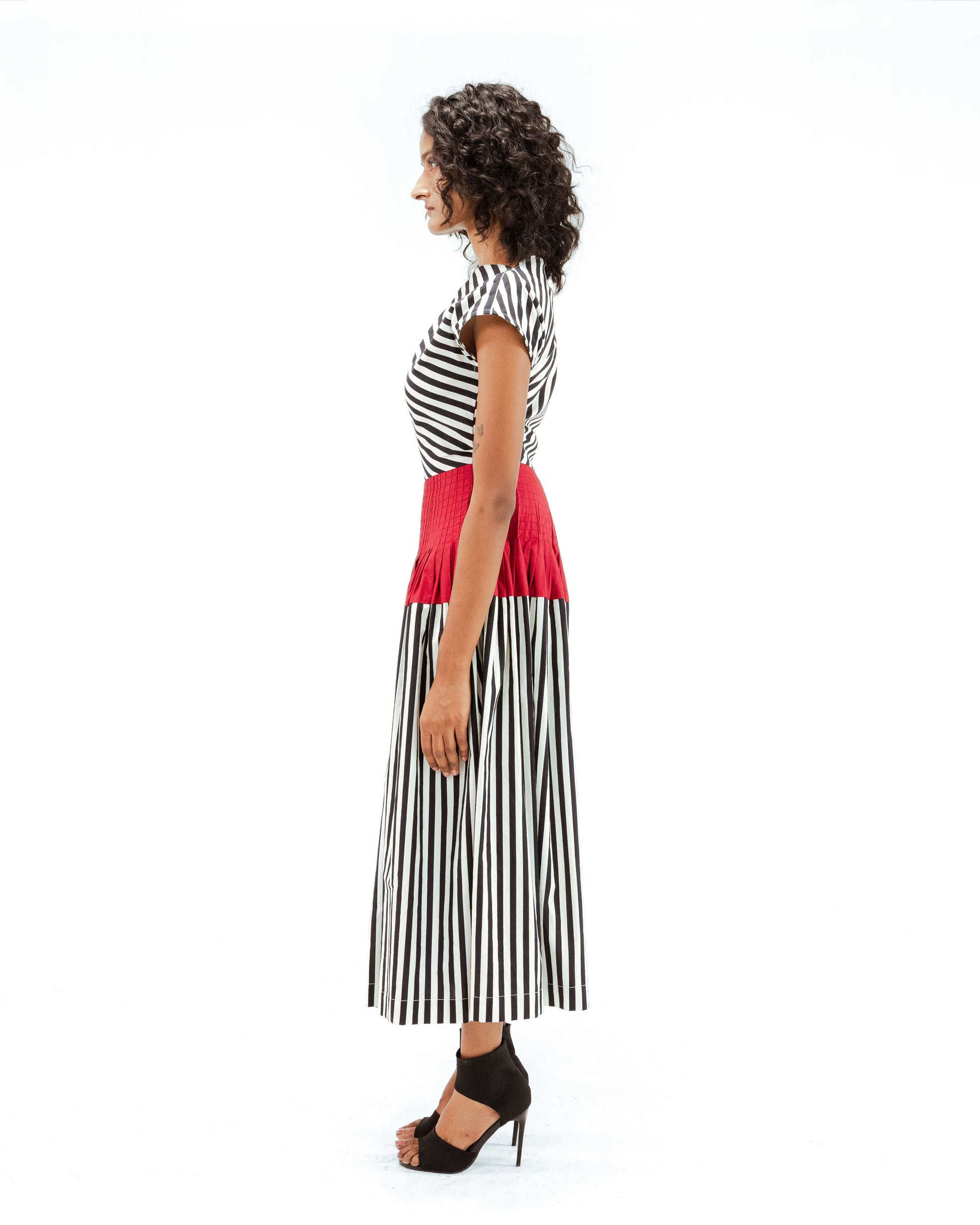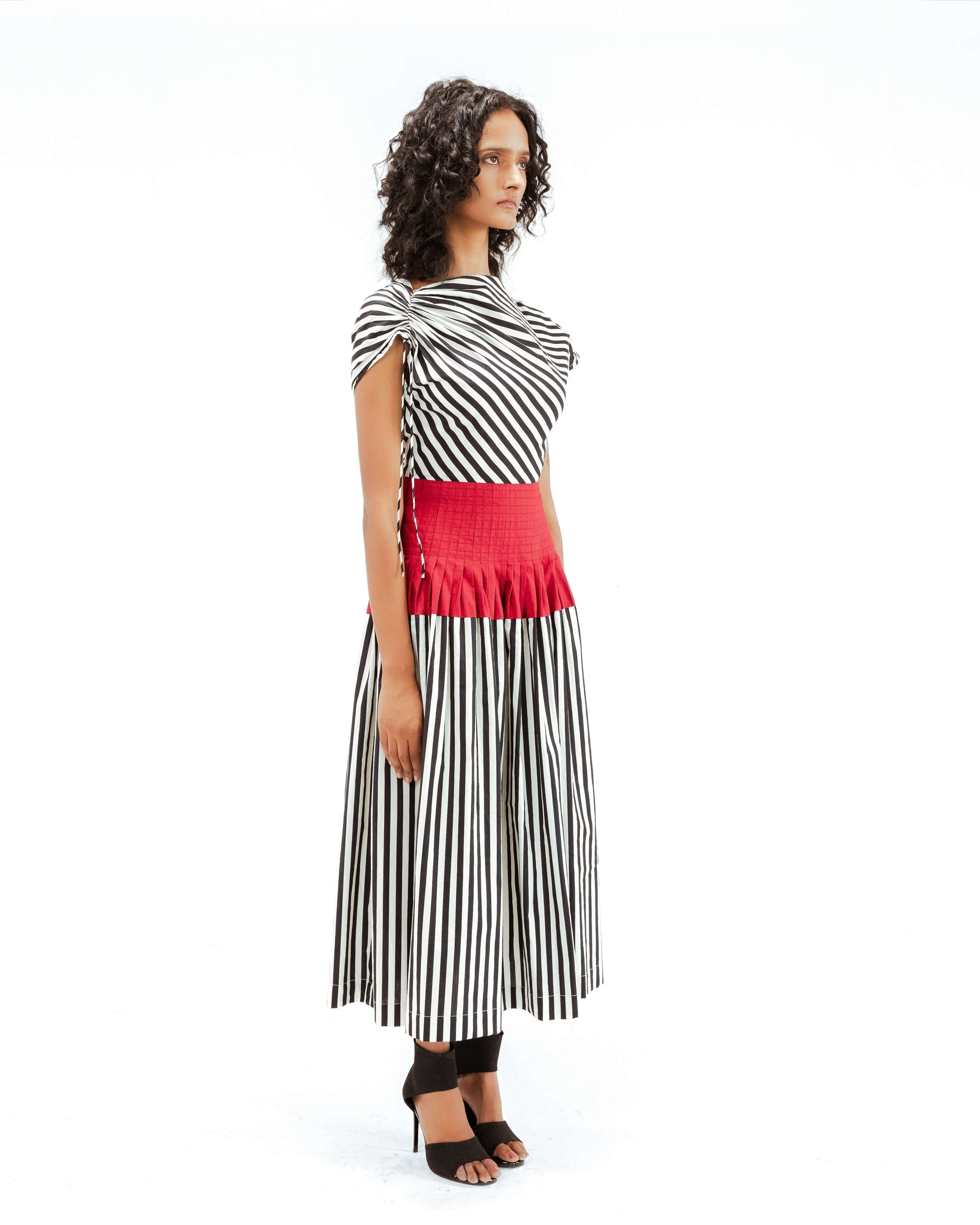 Crafted in striped cotton, this midi dress features an artful play of structure and fluidity with an asymmetric neckline ruched and draped on one side, the other a relaxed drop shoulder. The contrast waist panel is cinched with soft pleats and elevated by topstitch detailing, creating a silhouette that feels both sculptural and effortless. Model Height is 5'9". Model wears size S. Garment length is 50"