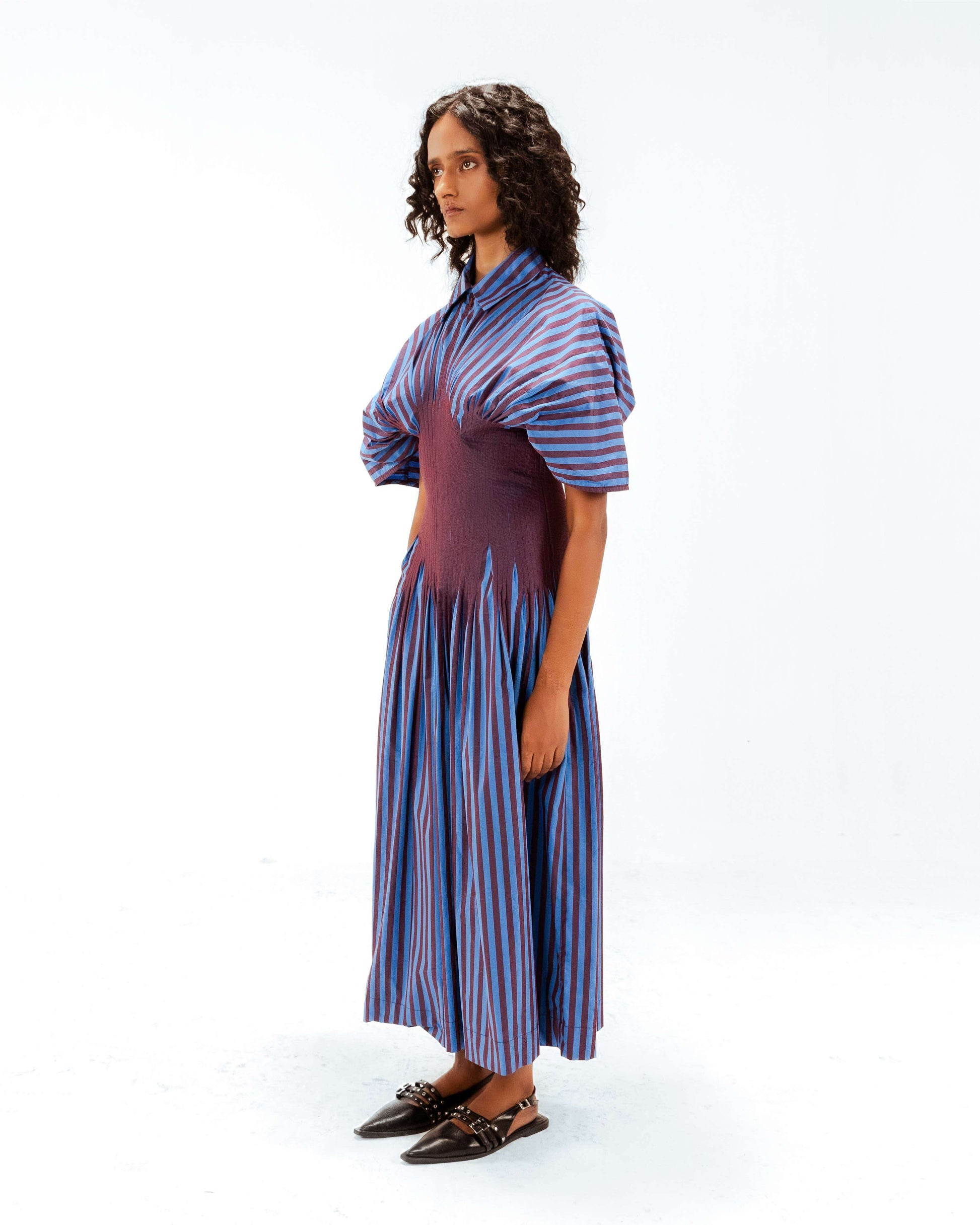 This cotton striped midi dress redefines structure with ease. Stripes are artfully gathered at the waist to create a flattering corset effect, while dropped shoulder balloon sleeves add a soft, voluminous contrast. Model Height is 5'9". Model wears size S. Garment length is 50"